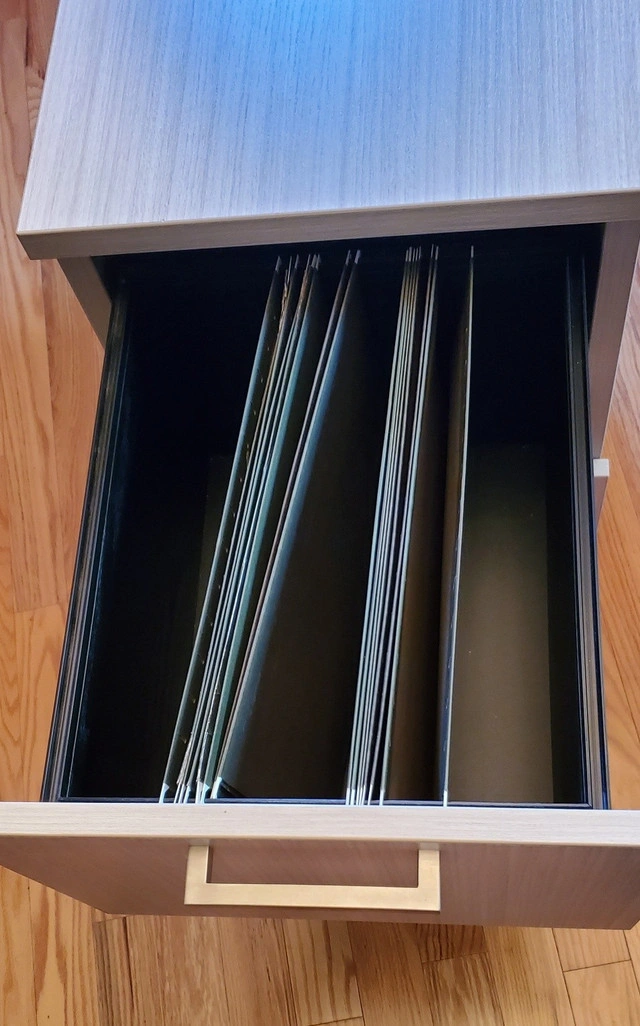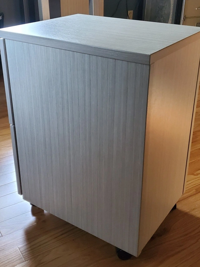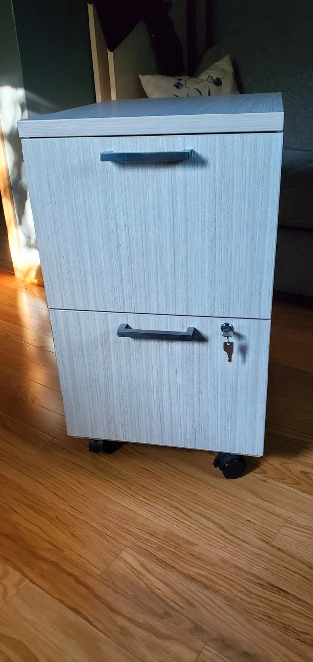 10I have 2 custom pedestals filing cabinets for sale. In prefect condition. IOF in dune colour laminate. Each has 2 drawers that can accommodate letter or legal size files with keys and locking casters. Hanging file holders included. 16.5" wide x 21" deep x 28.25" tall. Paid $650 each. Will sell for $300 each. Serious inquiries only. If the add is up, then it is still available.