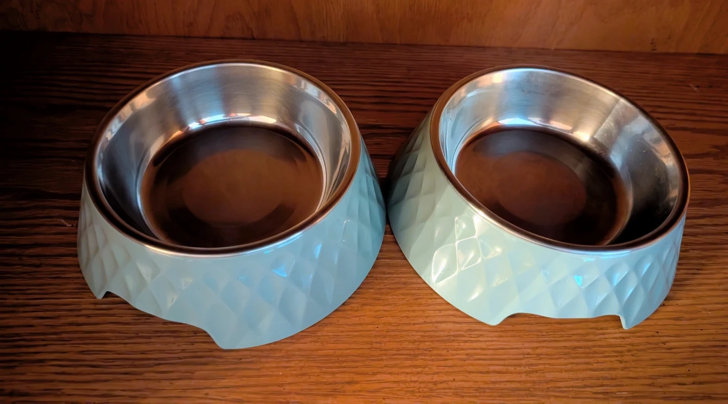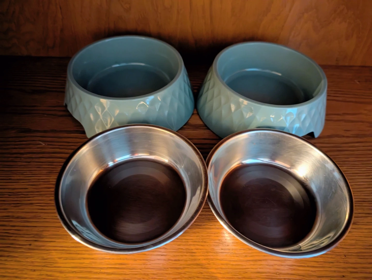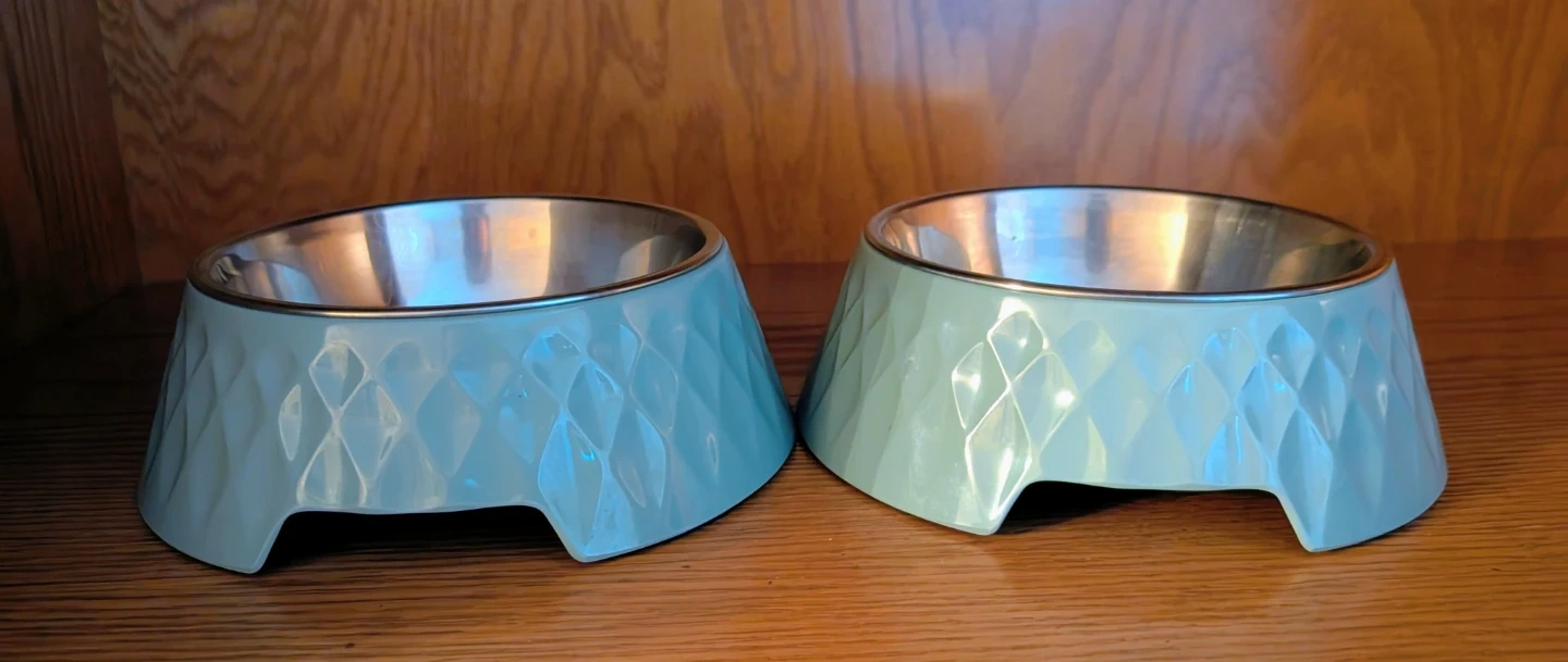 42Selling a set of two elevated dog bowls. They feature stainless steel bowls set in light blue stands with a geometric pattern. These are great for helping your furry friend eat comfortably!