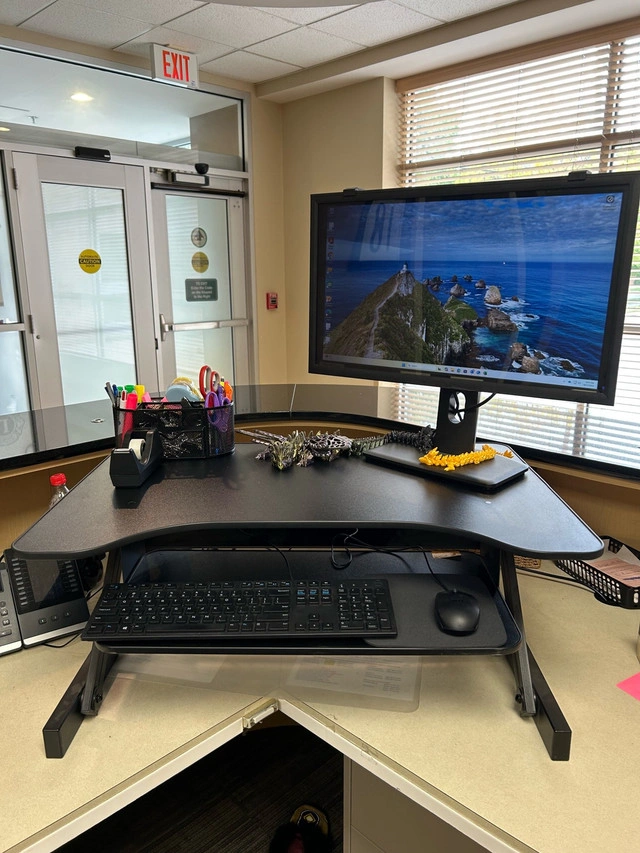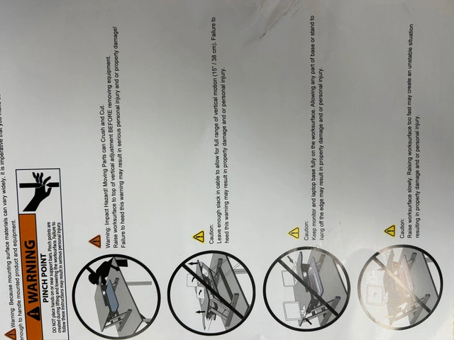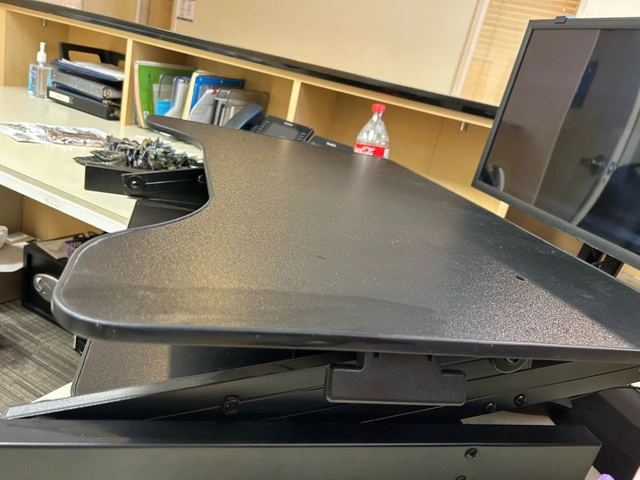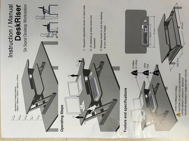 10Gently used ergonomic adjustable stand for desk. 5 height adjustable positions (165mm, 250mm, 325mm, 385mm, 415mm). Top section can hold 10-88lbs(4.5-40kg). Lower section can hold up to 6lbs(3kg). Can hold two screens or one screen and a laptop on the top section. Office is open Monday-Friday for pick ups.