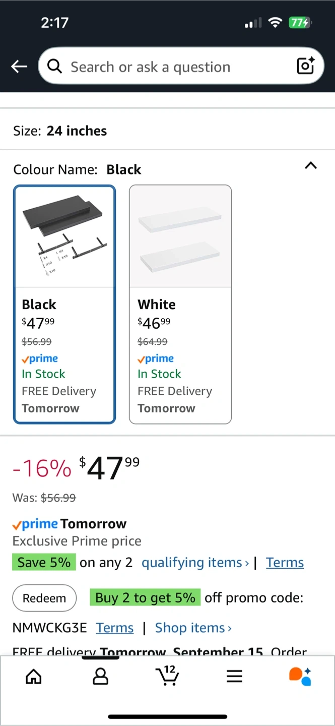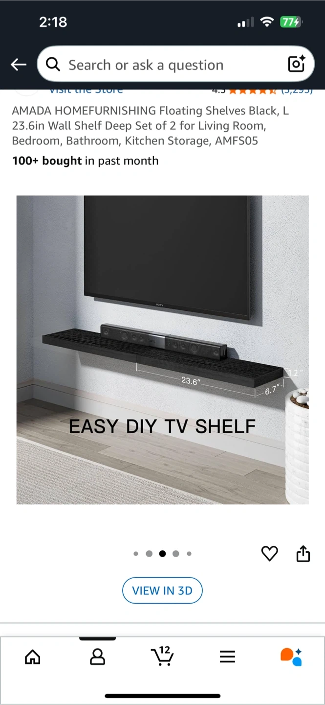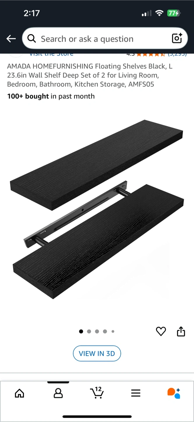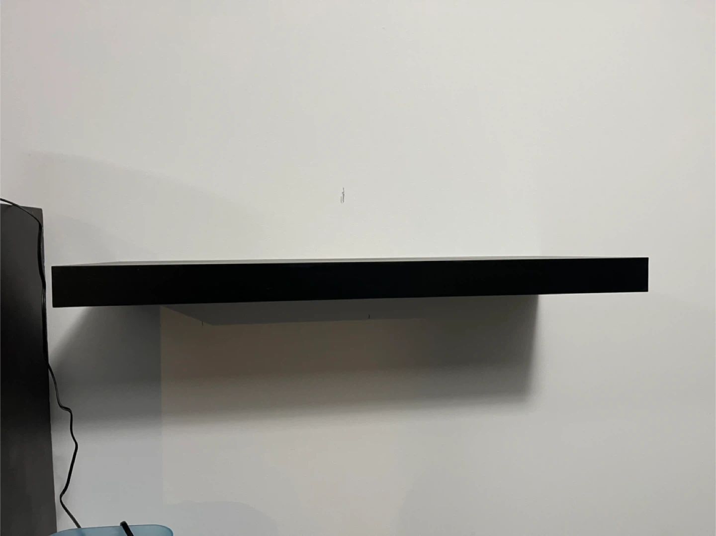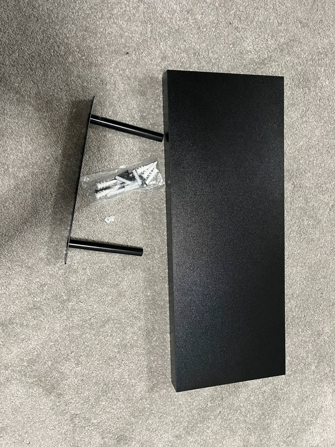 2 black floating shelves, 24 inches each Very easy to install, one was used for a few months, the other was never used, unopened hardware for installation Located in barrhaven