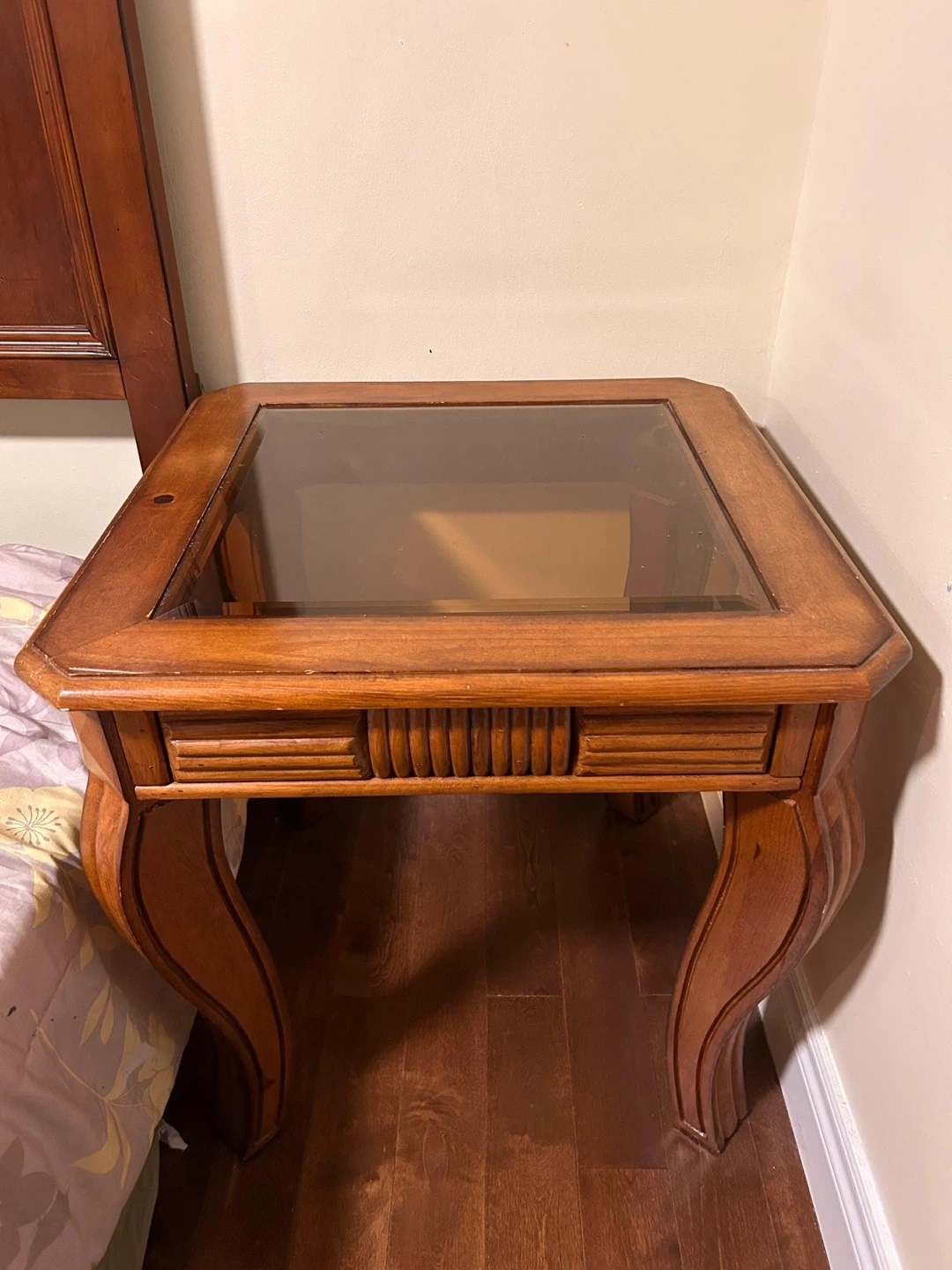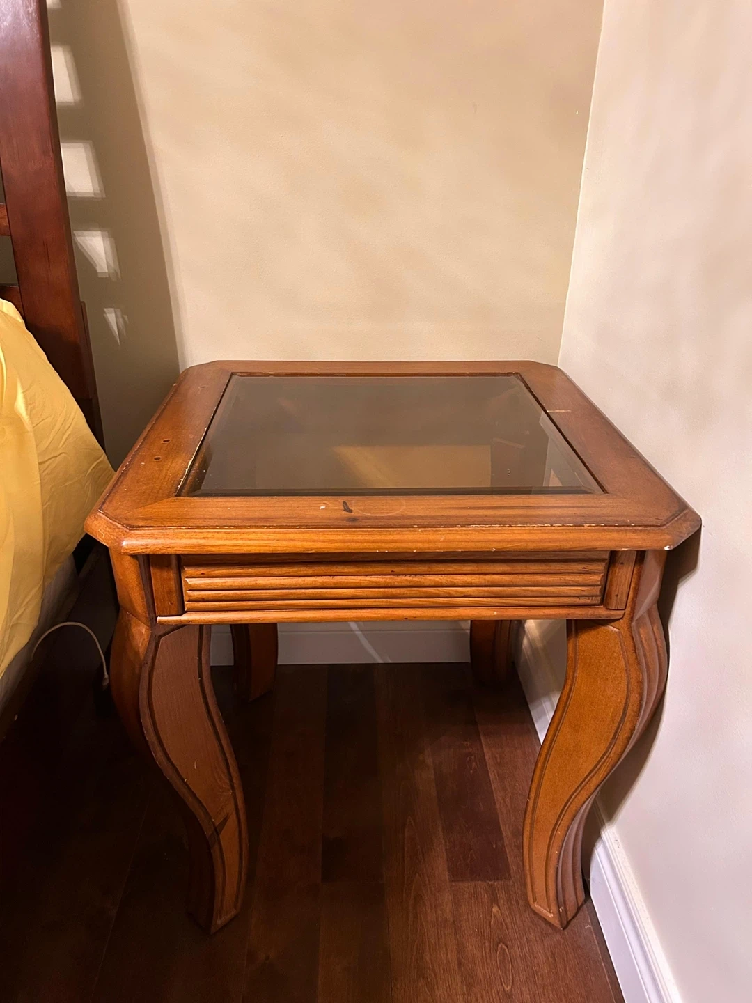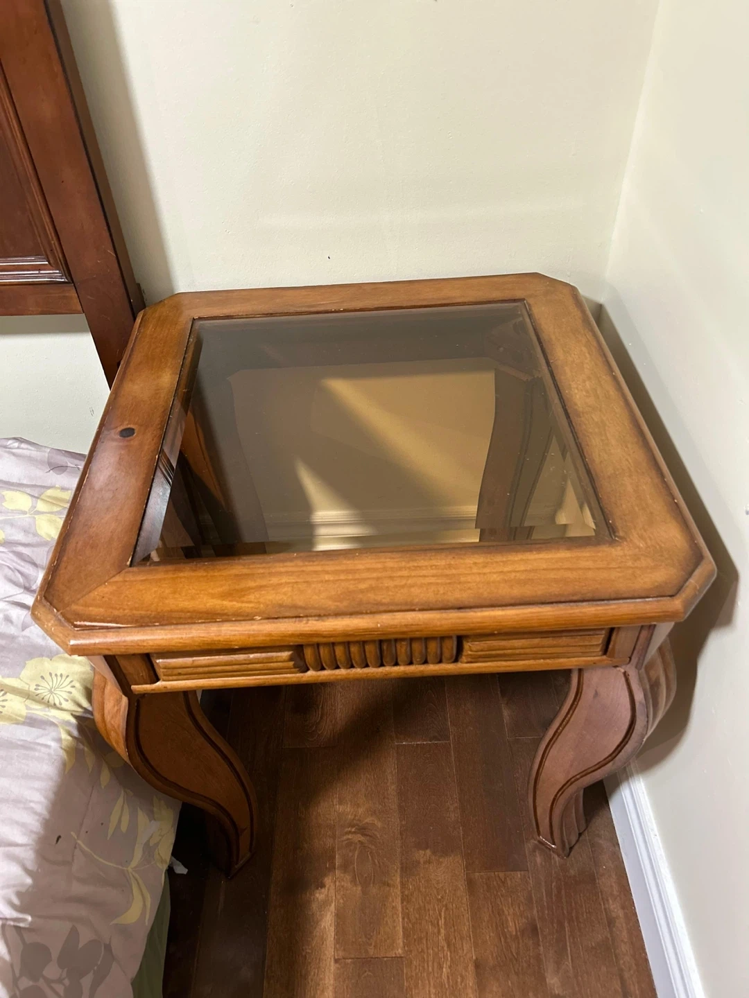 41These are lovely accent tables with a wood frame and a glass top, can be used as night stands as well. They have some minor signs of wear, but is still in good condition. There are 2 of them. Price reflects for both pieces together.
