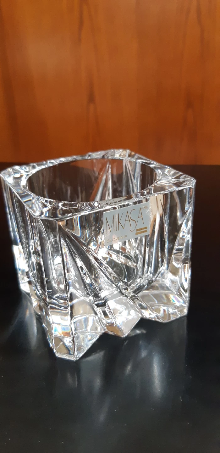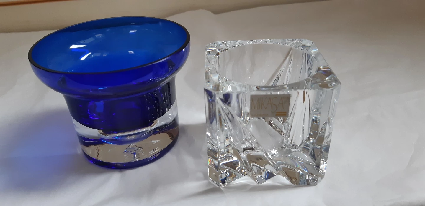 8402 lovely votive candle holders! The one by Mikasa is clear crystal with a unique geometric design and the other has a stunning cobalt blue colour. Both are in great condition and would look beautiful in any home!