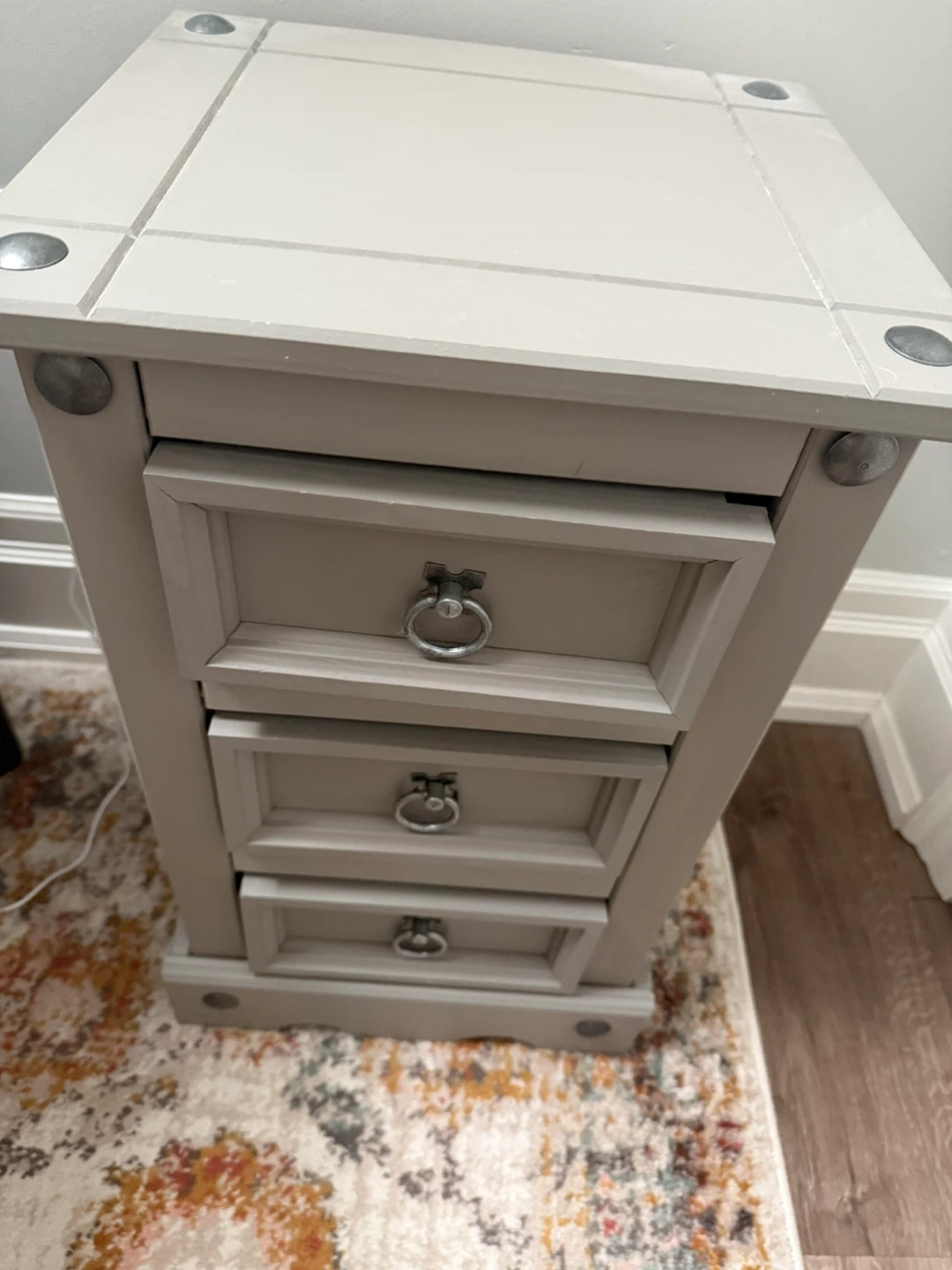 Here's a cute wood grey bedside table with three drawers! It's perfect for storing your nighttime essentials right next to your bed. The neutral colour would fit in with any decor.