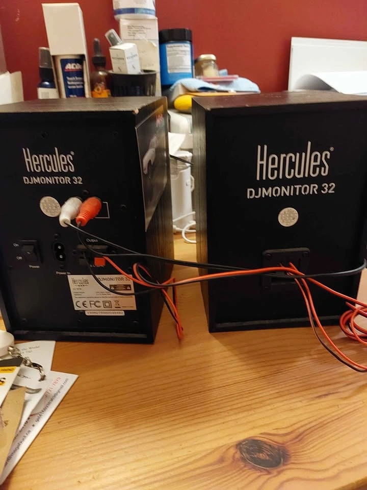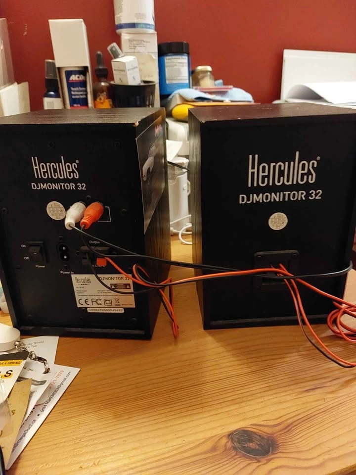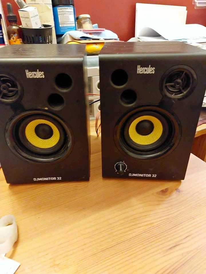 2 Hercules DJ Monitor 32 speakers. Excellent condition. 7 3/4 in tall. Output power 2X 15W. Includes power cord and connection cables between the speakers. WOODBINE/DANFORTH AREA.