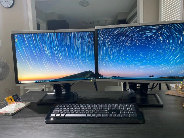 65Selling a pair of HP Compaq LA2405wg monitors. These 24-inch LCD monitors offer a sharp display and adjustable stand for comfortable viewing. Ideal for a dual-monitor setup, they enhance productivity and are great for office or home use. These monitors are in good condition. Specifications: * Screen Size: 24 inches * Resolution: 1920 x 1080 * Ports: VGA, DVI, DisplayPort * Adjustability: Height, tilt, swivel, pivot * Price is $75 each or $150 for both. Downsizing to a laptop thus getting rid of these otherwise they were so good and screen can rotate in both horizontal or vertical alignment. One is a newer screen bought this year itself. They’ve been reliable and are ready to keep on keeping on. If the ad is up, the monitors are available!