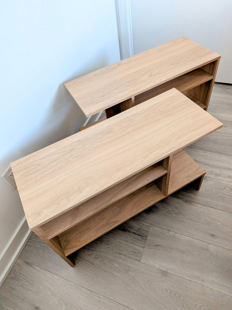 Selling 2 stylish IKEA wood shelves in great condition! Perfect for adding some storage and style to your space. It's a unique piece that can be used in various ways around the house, you can place them side by side or stack them on top of each other. Retails for $89 per piece. https://www.ikea.com/ca/en/p/holmerud-side-table-oak-effect-40541421/