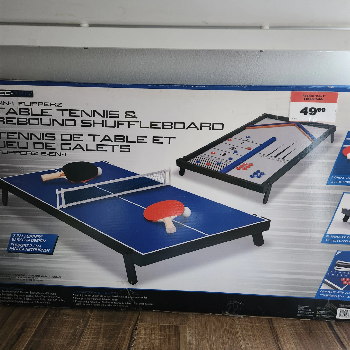Selling a 2-in-1 Flipperz Table Tennis & Rebound Shuffleboard game! It's ready to play in minutes with easy setup and storage. Perfect for play on a table or floor. Includes 2 paddles, 1 ball, net & post set, and 20 built-in scoring sliders in 2 team colors. Pick up