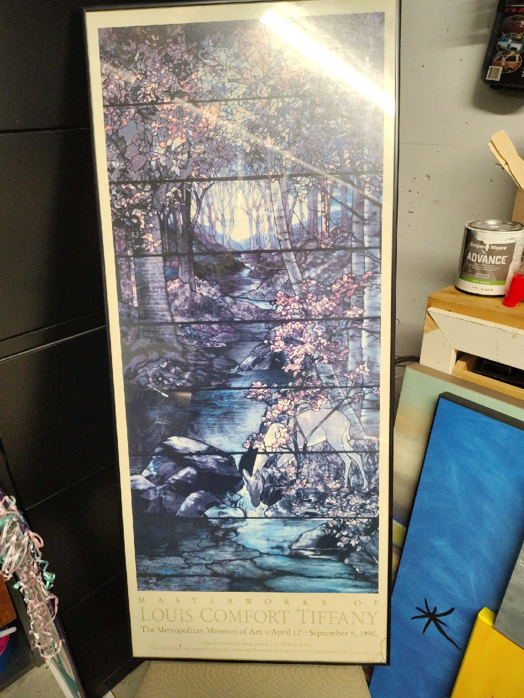 90Framed poster featuring the Masterworks of Louis Comfort Tiffany exhibition at The Metropolitan Museum of Art, April to September 1990. A beautiful piece of art!