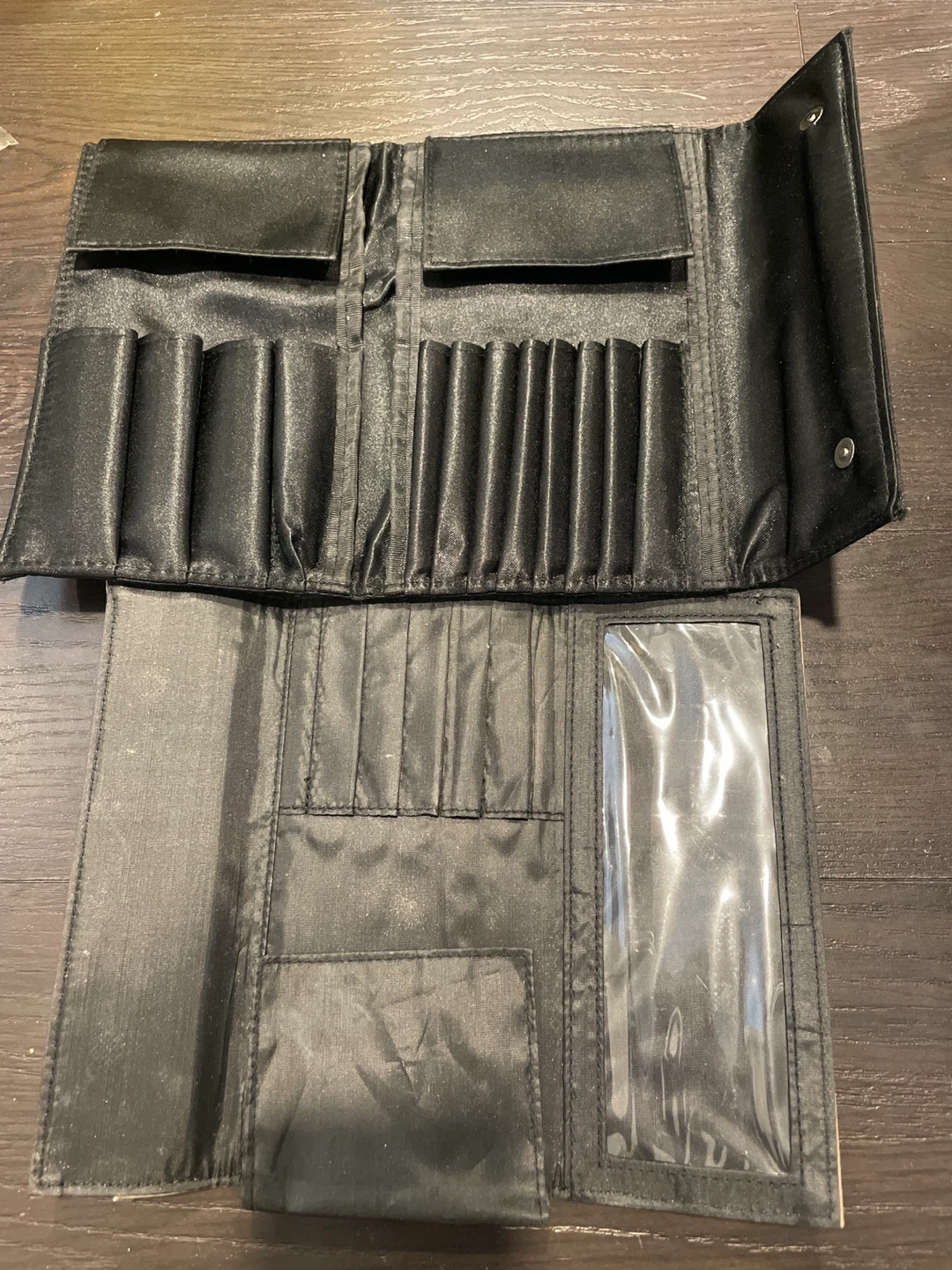 618$3 ea and 2 for $5 Here's a handy black roll-up case for your makeup brushes! It has lots of slots to keep your brushes organized and protected. It's in good condition and ready for a new home