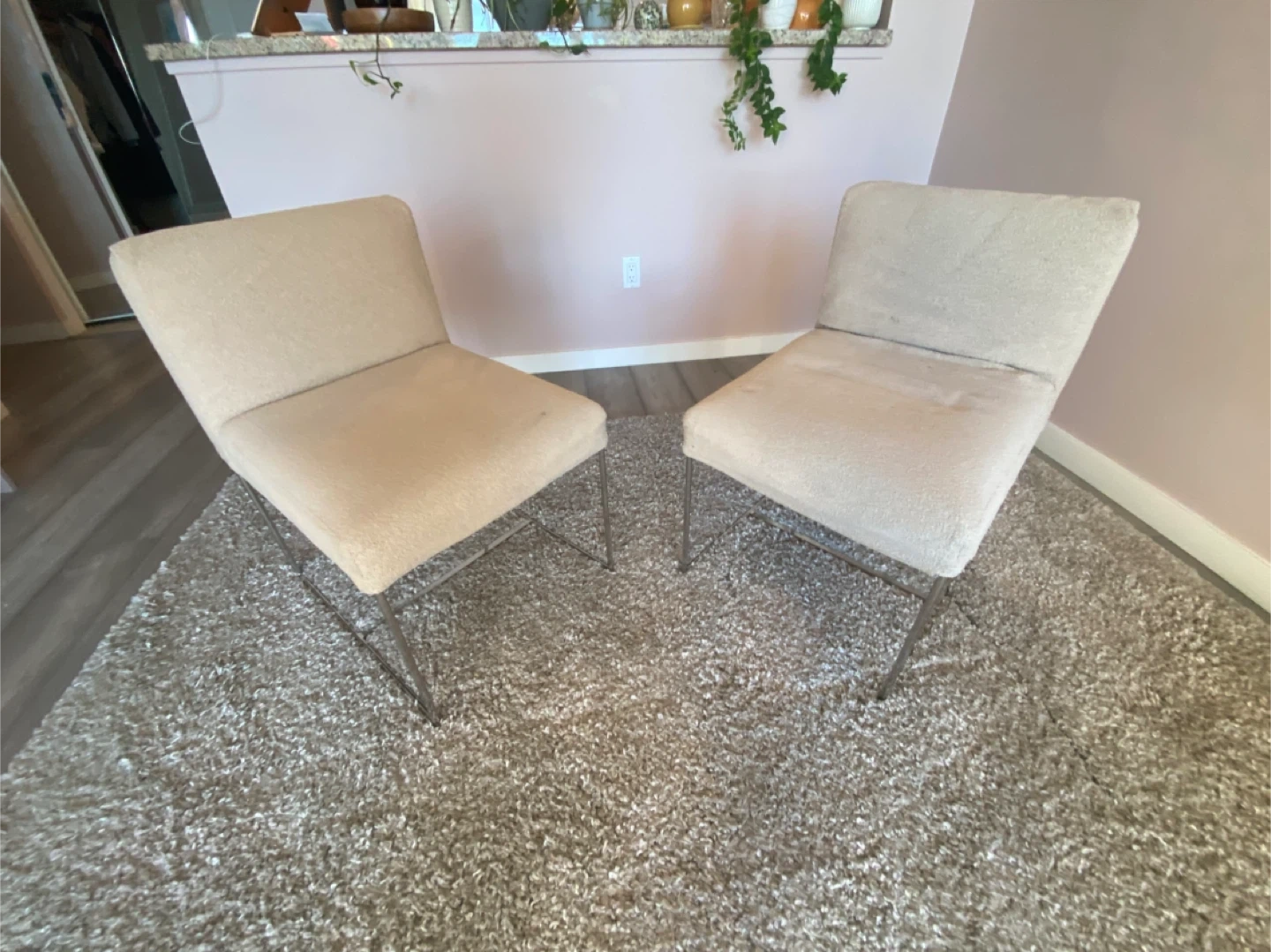 Selling a set of two accent chairs in a neutral beige colour. They're in great condition and would look lovely in any living space! The chairs have a soft, textured fabric and sleek metal legs, adding a touch of modern elegance to your home. Removable covers that are machine washable.