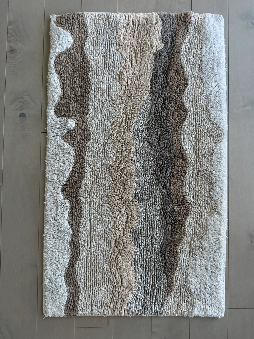 This is a shag rug with a neutral tone. It has a wavy line design in shades of beige, brown, and cream. It measures approximately 20 inches by 31 inches. Perfect for adding a cozy touch to any room in your home!