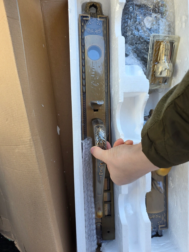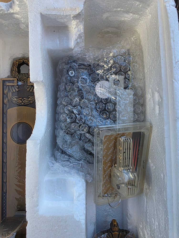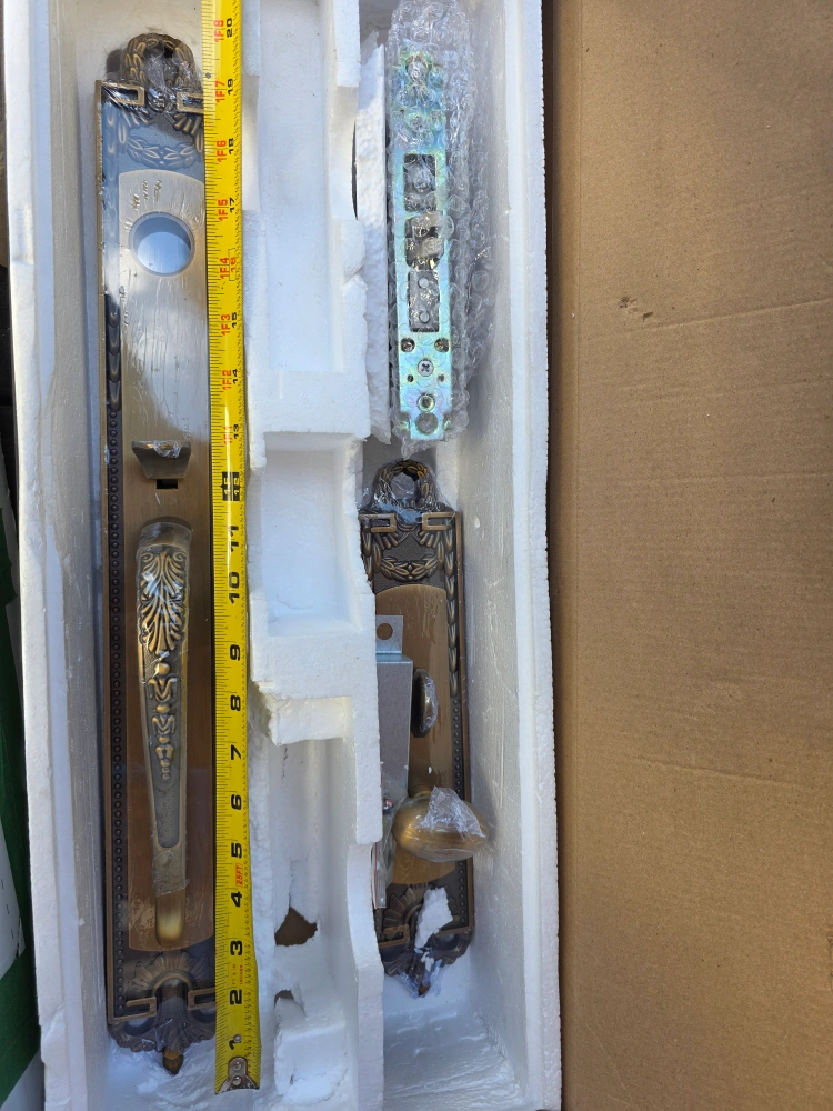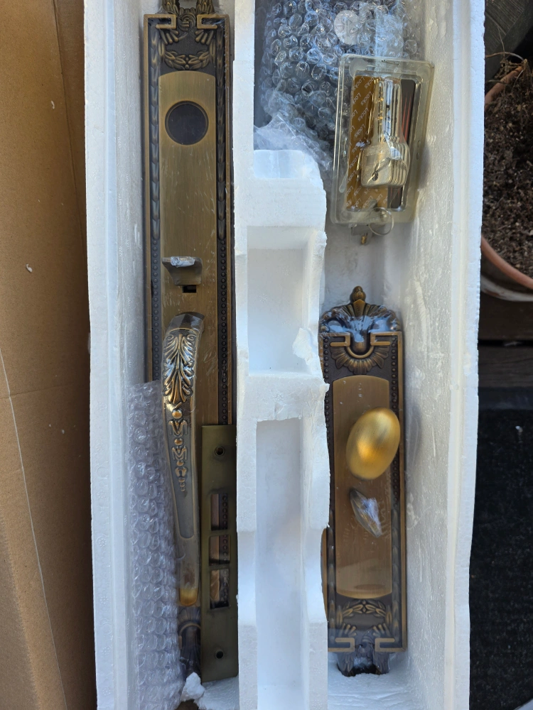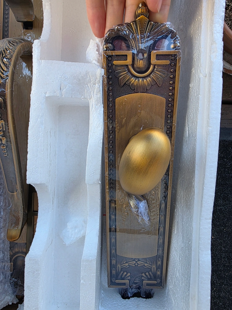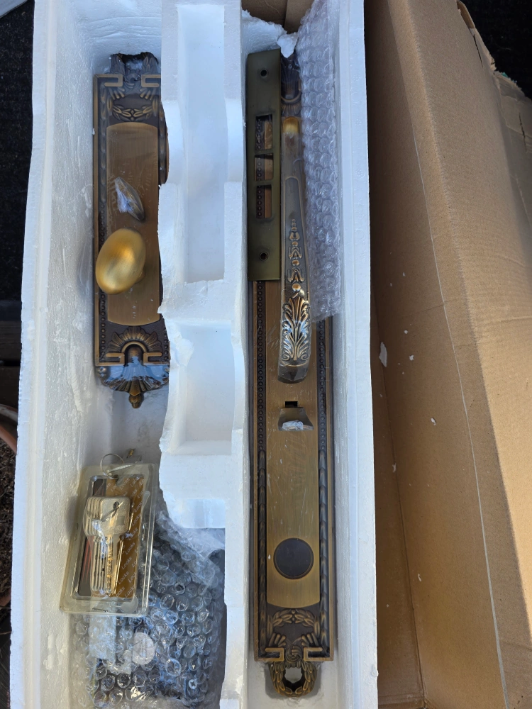 Selling a brand new, ornate door handle set. It's a beautiful bronze colour and comes complete with all the necessary components and keys, still in its original packaging. The set has a very detailed and elegant design, perfect for adding a touch of sophistication to your home.