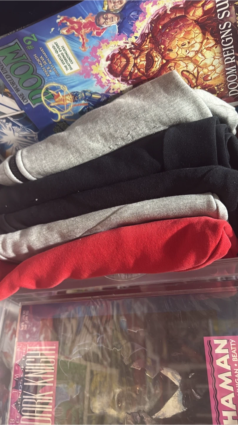 Hoodies are large pants are medium there brand new the red pants are a little worn but nothing like major