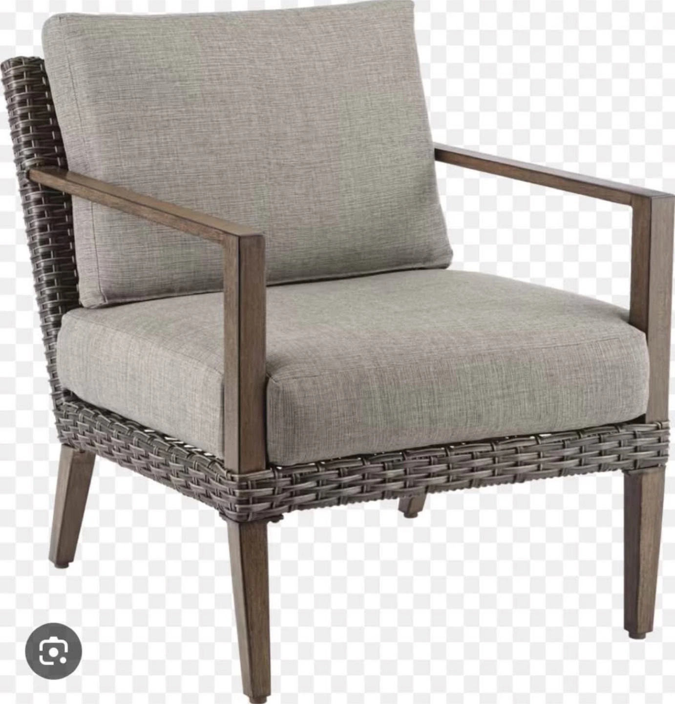 10Comfortable outdoor armchair. Wicker frame with grey cushions. Wooden armrests. Perfect for relaxing on your patio or deck. 2 rarely used patio chairs $99 each Has never been out in the rain Sat on only a handful of times Bought for $250+ tax each = $500+ for both