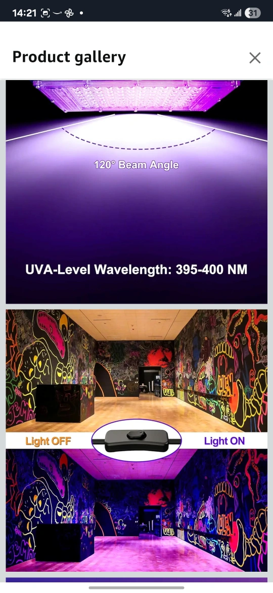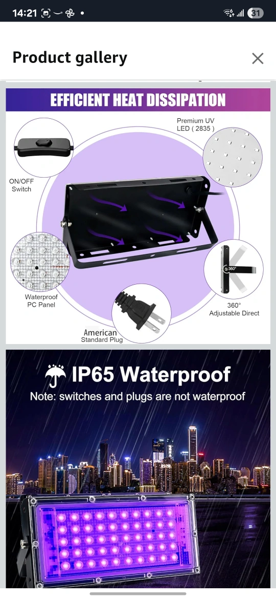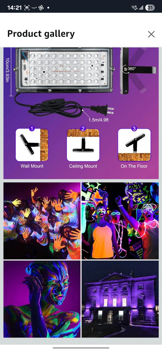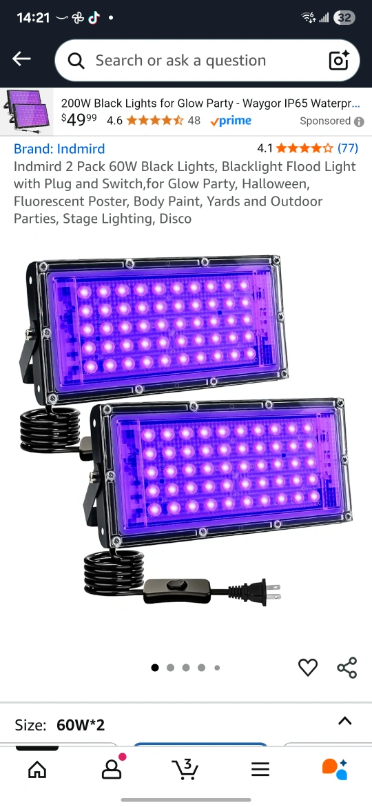 Selling a pair of Indmird 60W black lights. These are great for glow parties, Halloween, fluorescent posters, body paint, yards, outdoor parties, stage lighting, and even disco! They can be wall mounted, ceiling mounted, or placed on the floor. Wavelength is 395-400 NM