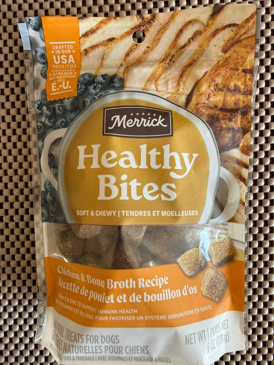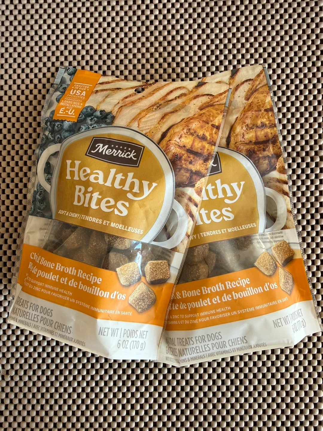 1000+MEETING LOCATION: **Scarborough Town Centre Mall **Cash payment only Merrick Healthy Bites Soft & Chewy dog treats! 2 bags X 170 g Each In original sealed condition These are the Chicken & Bone Broth Recipe flavour. They are natural treats for dogs, with added vitamins and minerals. **Best before September 2026