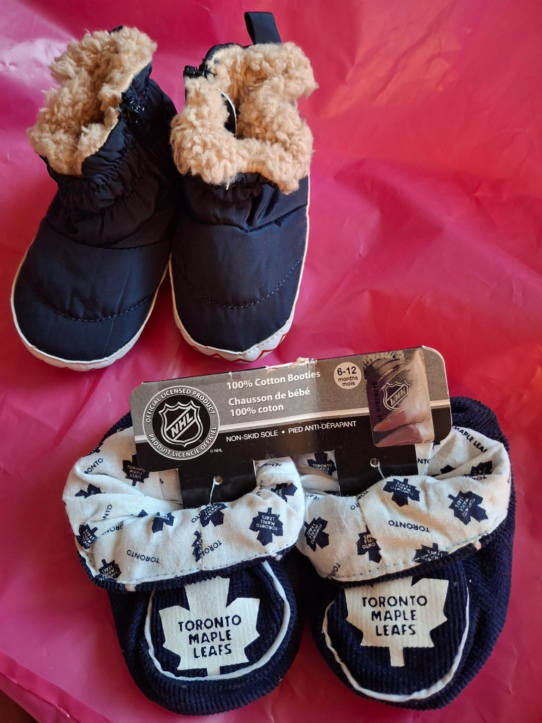 2 pairs of baby slippers, never been worn. -Leaf slippers size 6-12 months -Others faux fur lined, slightly bigger. Price is for both together. Available for pickup in Markland Wood.