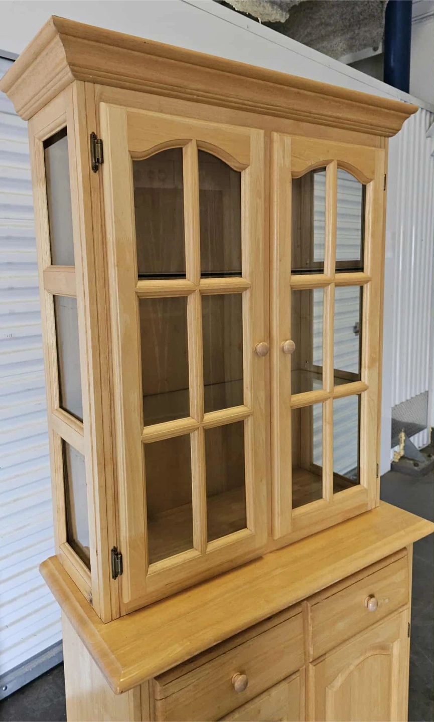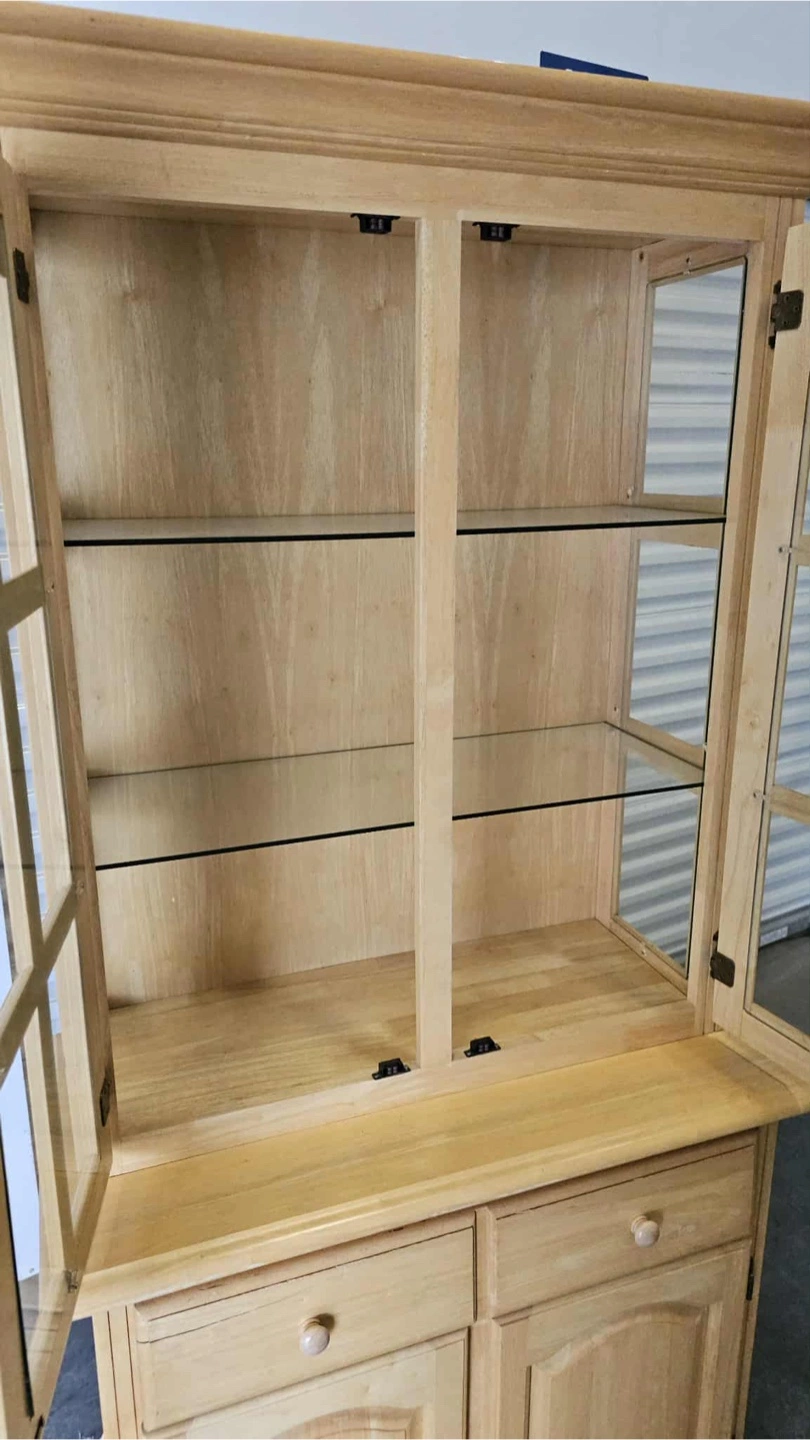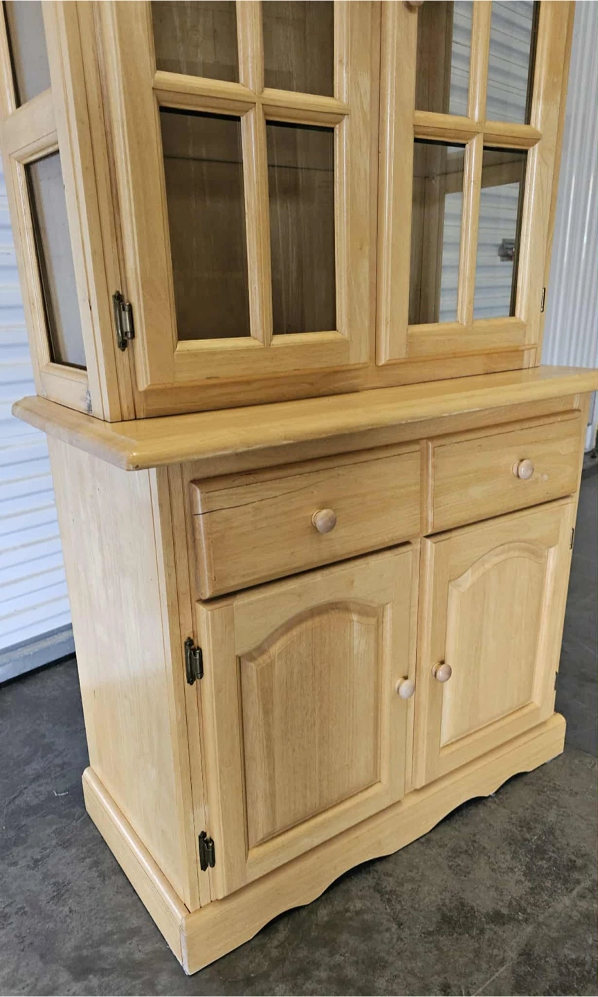 512 piece Solid pine hutch with glass doors/ shelves hairline split on drawer front 37w x 18.5 × 74.25h
