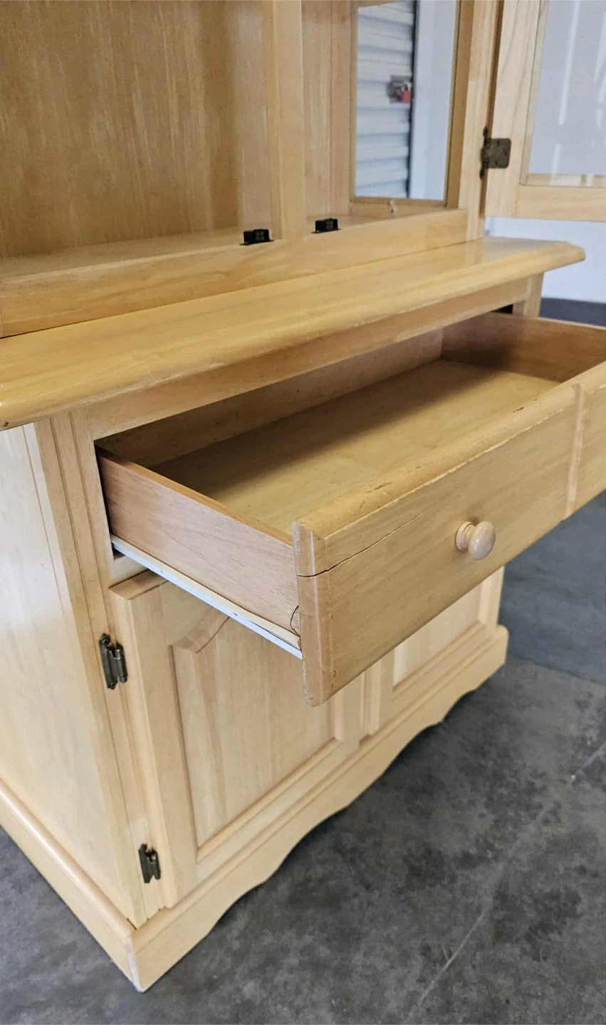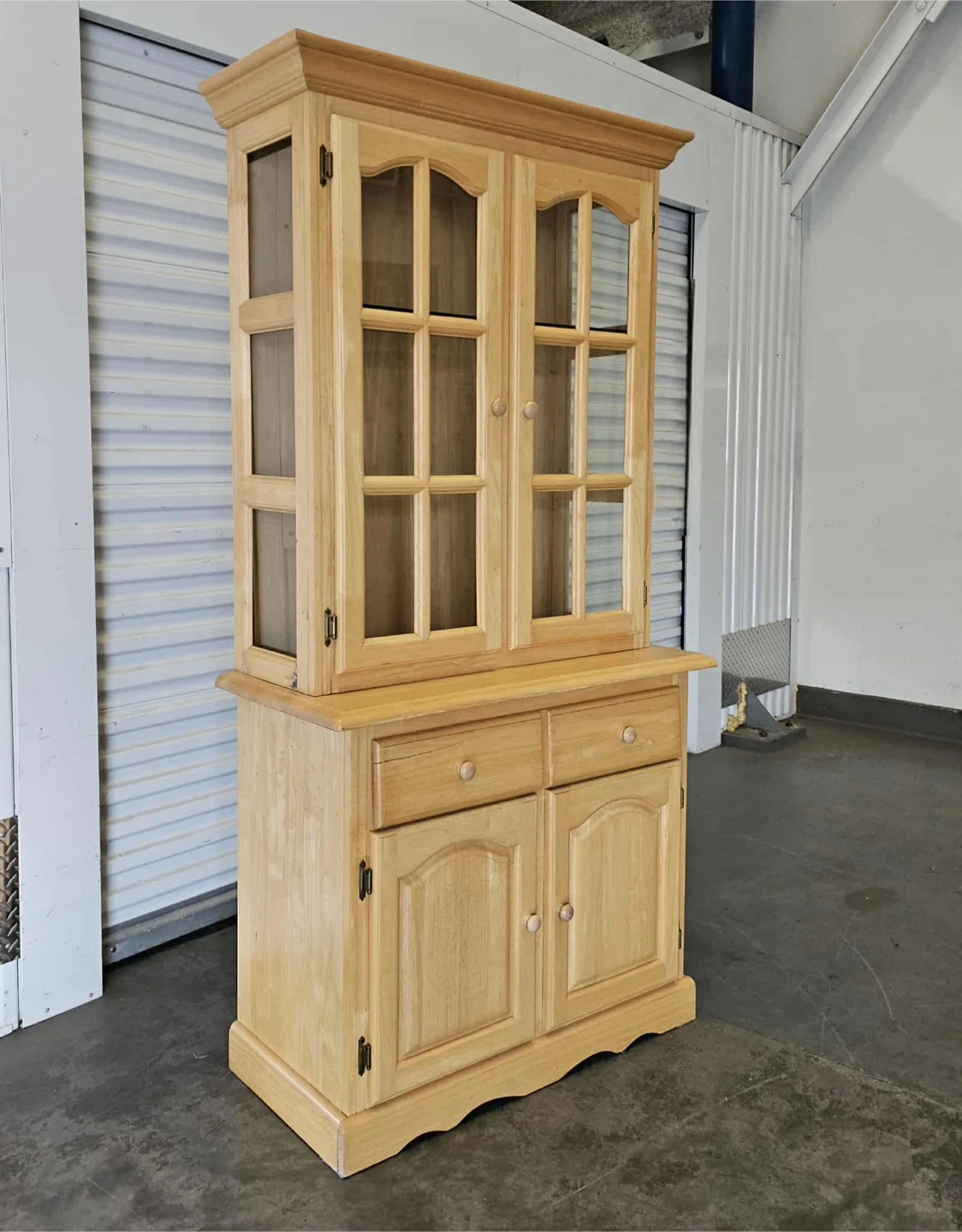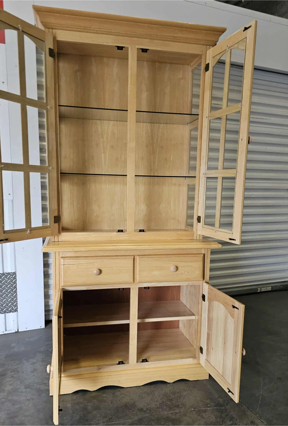 512 piece Solid pine hutch with glass doors/ shelves hairline split on drawer front 37w x 18.5 × 74.25h