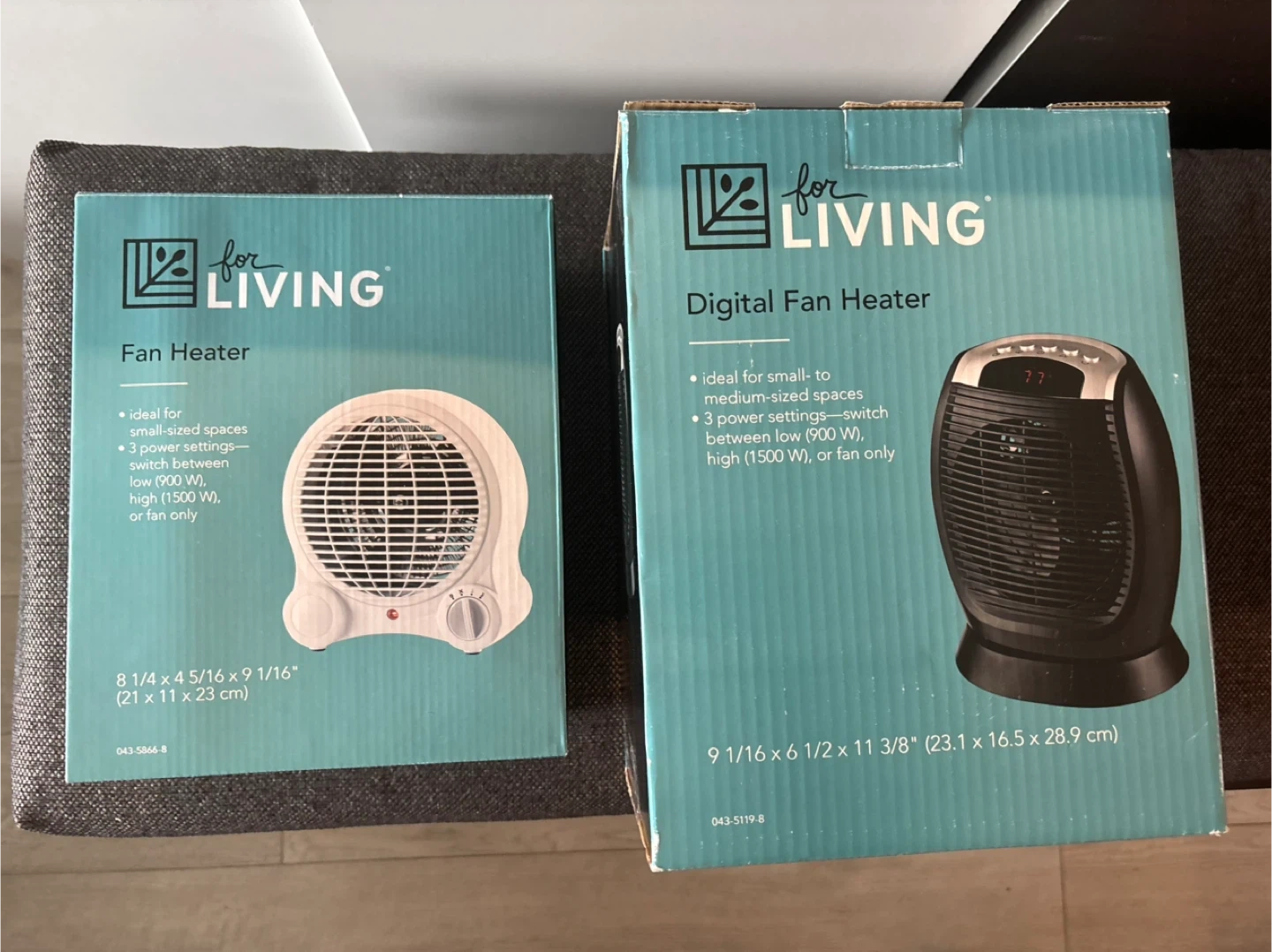 37Selling a set of 2 pieces• fan heater and a digital fan heater. The fan heater is ideal for small-sized spaces and has 3 power settings: low (900 W), high (1500 W), or fan only. Its dimensions are 8 1/4 x 4 5/16 x 9 1/16" (21 x 11 x 23 cm). The digital fan heater is ideal for small- to medium-sized spaces and also has 3 power settings: low (900 W), high (1500 W), or fan only. Its dimensions are 9 1/16 x 6 1/2 x 11 3/8" (23.1 x 16.5 x 28.9 cm)