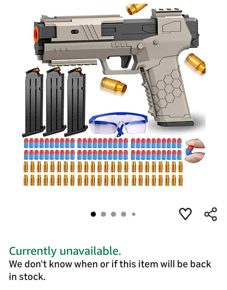 67Came from USA amazon Currently unavailable now on Amazon US . So 2 Toy Gun Soft Bullet, Educational Model Toys Pistol Shooting Games Shell Ejecting Toy Guns Foam Blaster, with 60 PCS EVA Foam Soft Bullets 3 Magazines and Goggles, Gifts for Kids Boys Girls really good for kid. It was for Halloween couple years a go and now new to sell