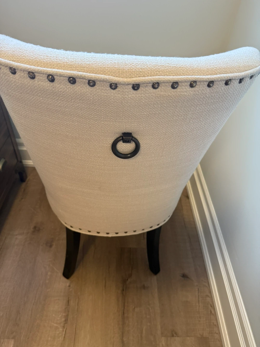 Selling a lovely upholstered accent chair in cream. It's in great condition and would look great in any room! The chair features a unique ring detail on the back and nailhead trim around the edges.