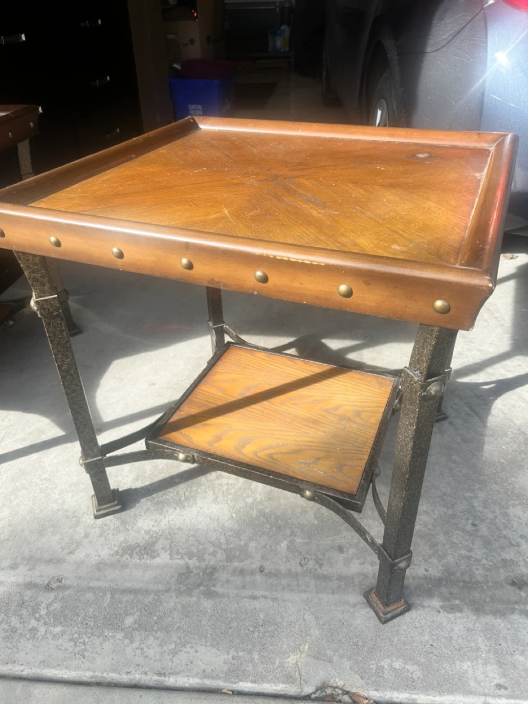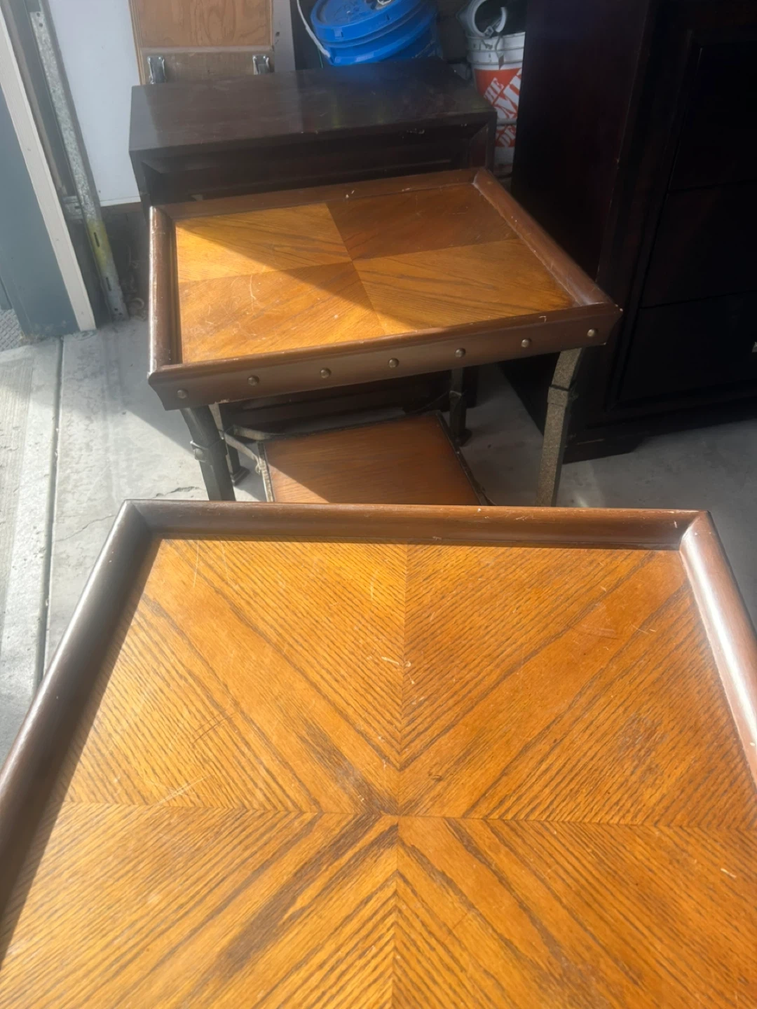 Selling a set of two wooden end tables. They have a unique design with a lower and metal accents. Perfect for adding a touch of rustic charm to your living room or bedroom!