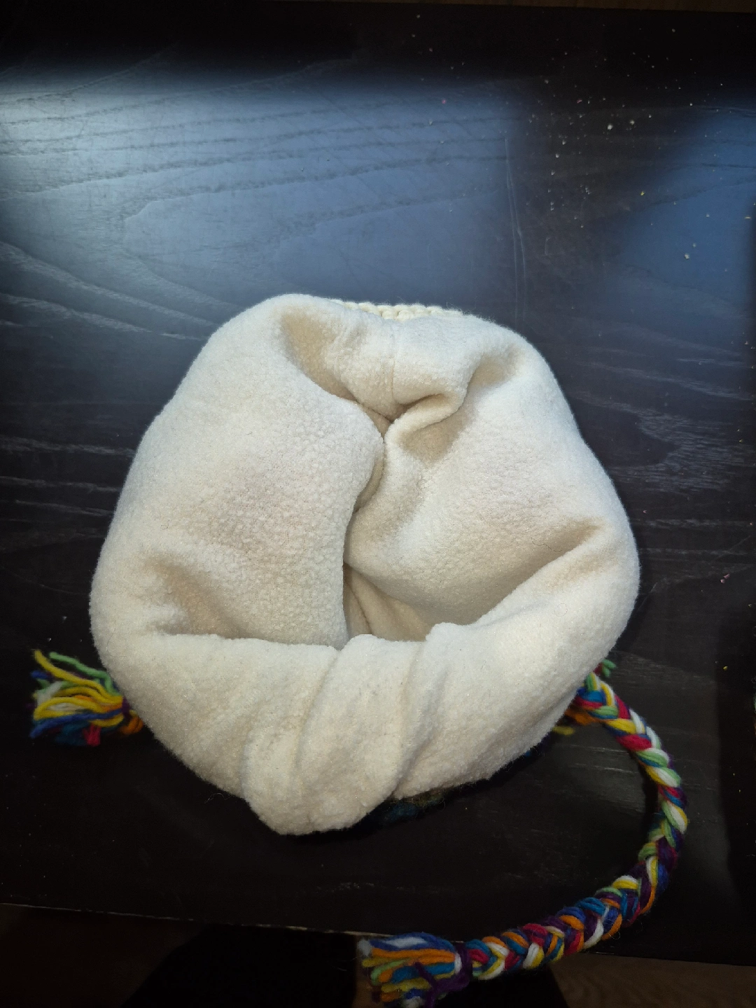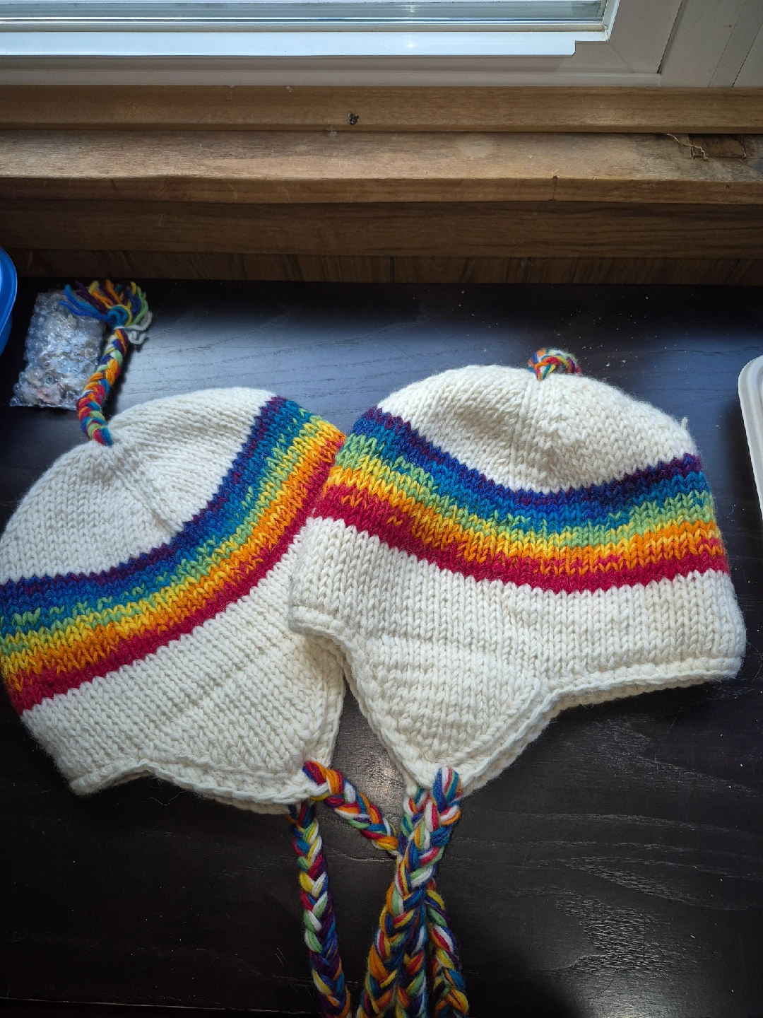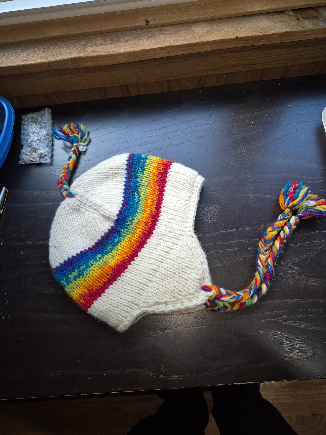 Cozy and colourful wool hat, handmade in Nepal! It's a knit hat with a rainbow stripe and braided ties. Perfect for keeping warm this winter. The material is 100% wool.