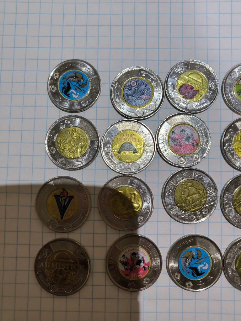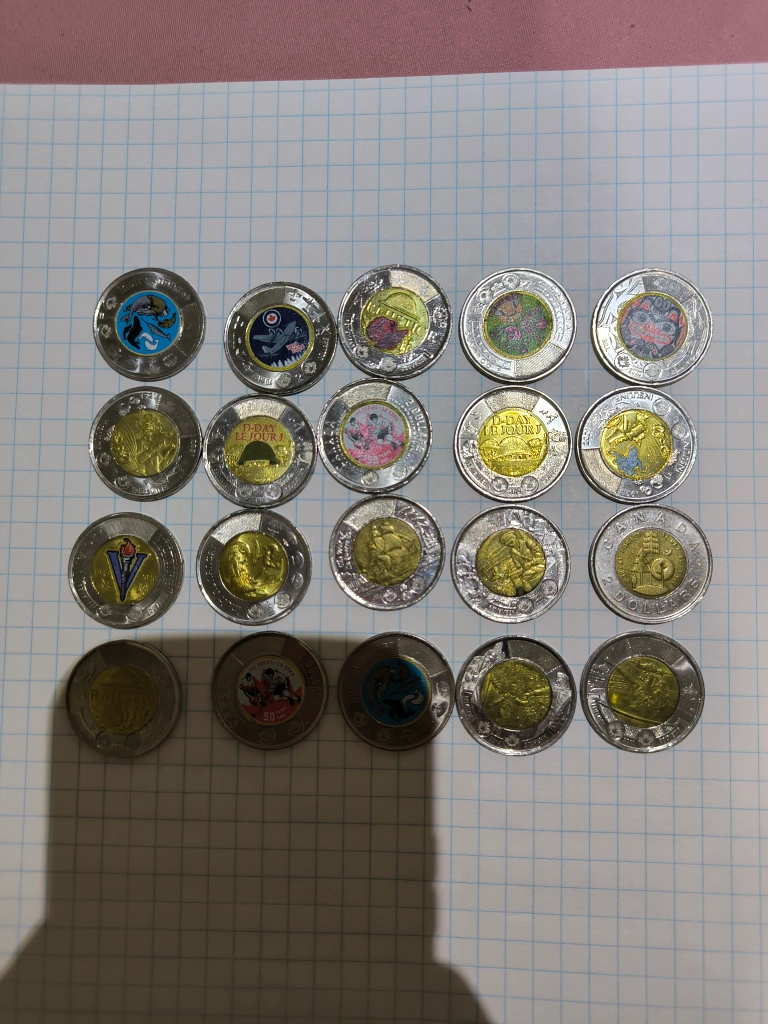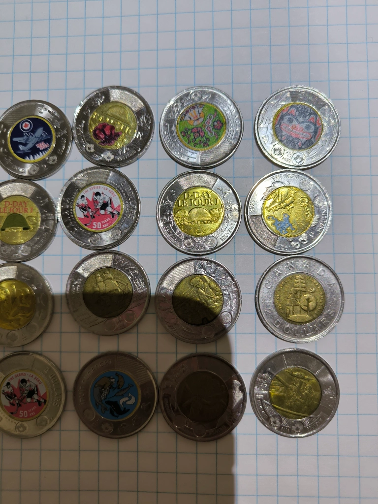 10Selling a collection of Canadian two-dollar coins (toonies). These coins feature various commemorative designs. A great addition for collectors!