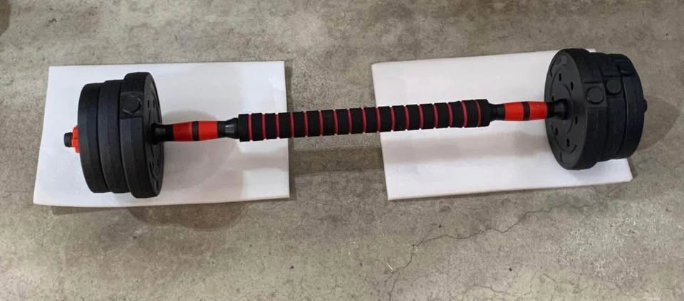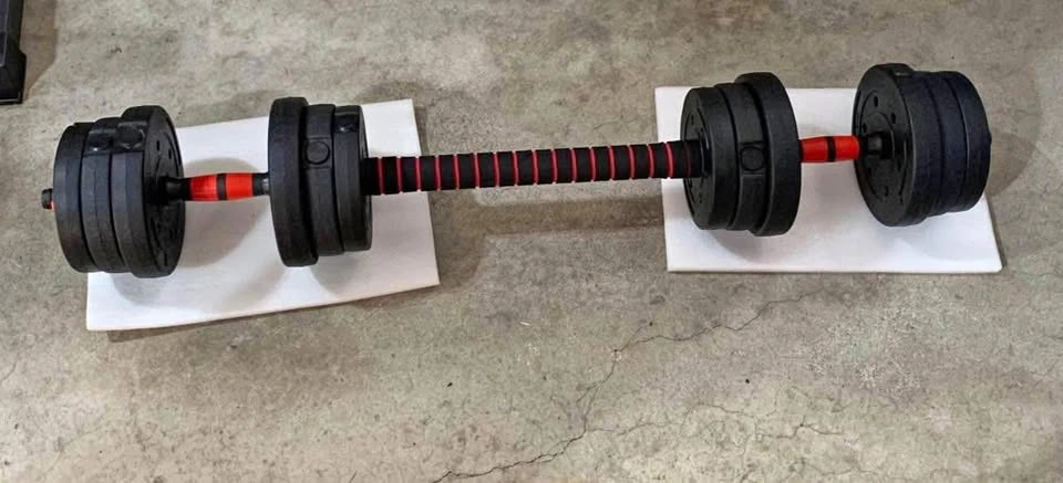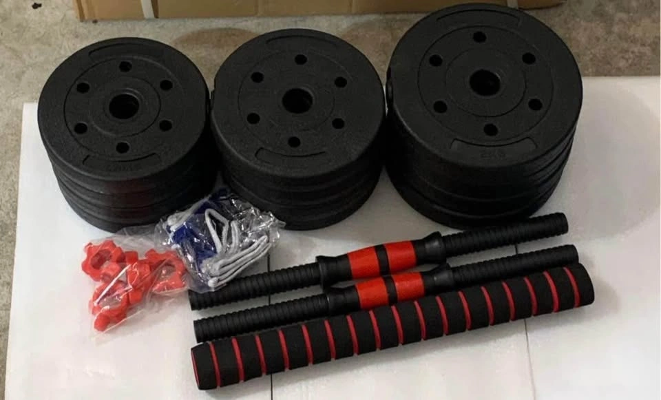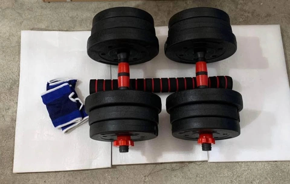 Adjustable Dumbbells with Barbell Connecter Set Includes: 4 x 2 KG Plates 4 x 1.5 KG Plates 4 x 1.25 KG Plates 2 x Handlebars 4 x Lock Collars 1 x Connecter Total Weight: 20 KG/44 LBS (Including the Bars and Connecter) No gloves