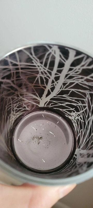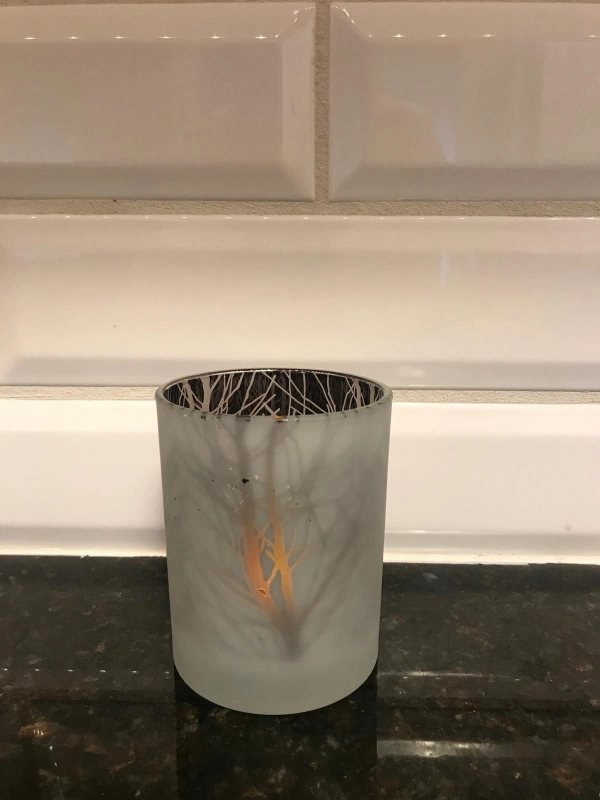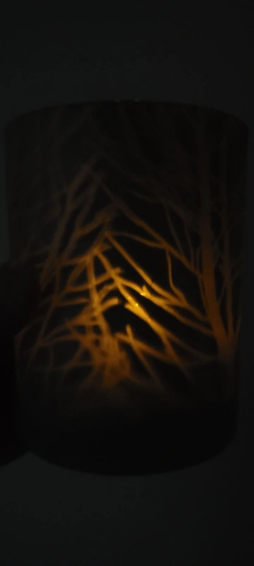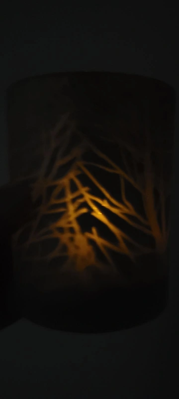 Candle holder that shows reflections of tree branches when lit up.