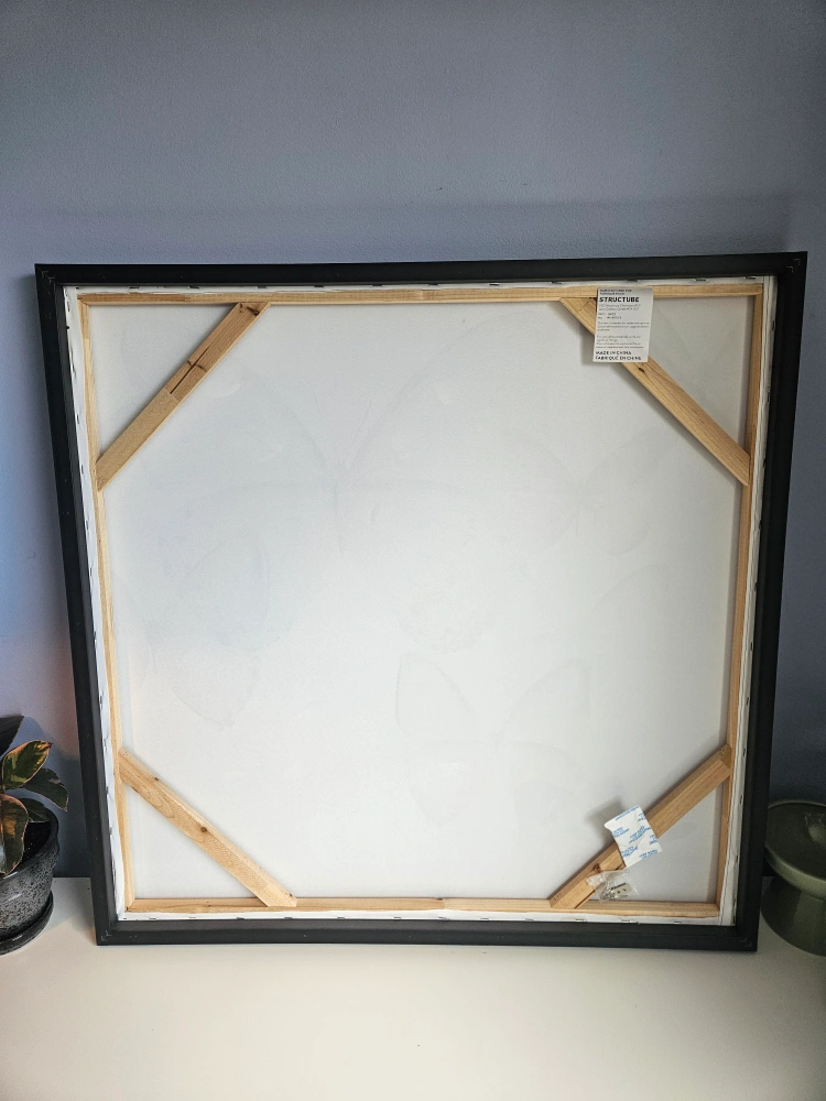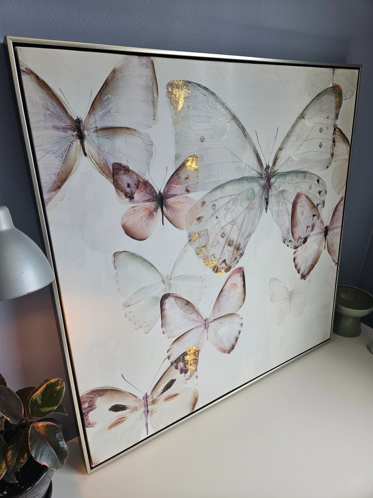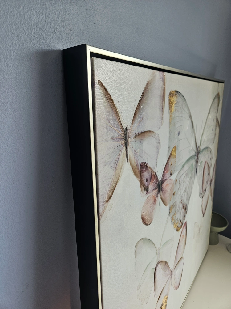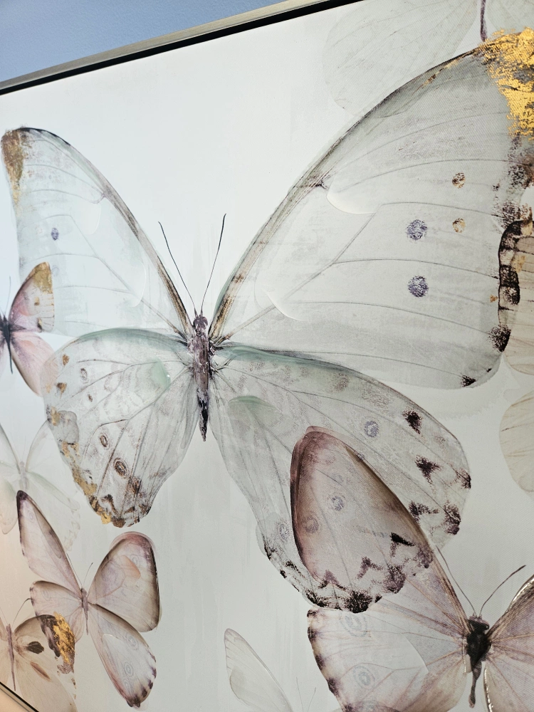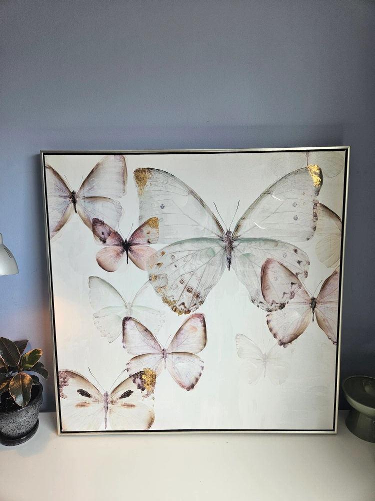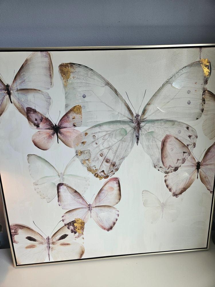 Up for sale I have a beautiful butterfly artwork with splashes of gold leaf. Purchased from structube, never hung. Includes mounting materials. 33x33 inches.