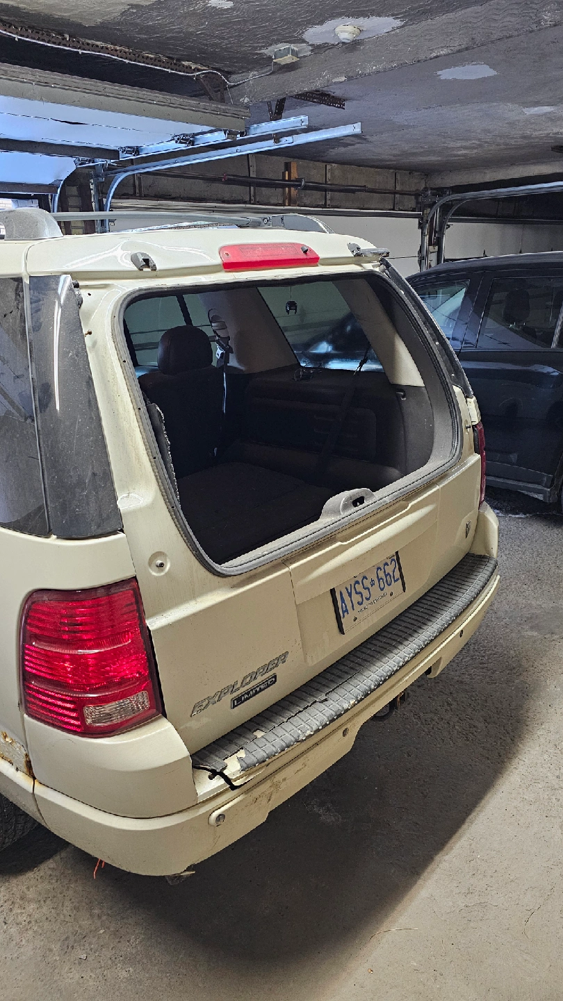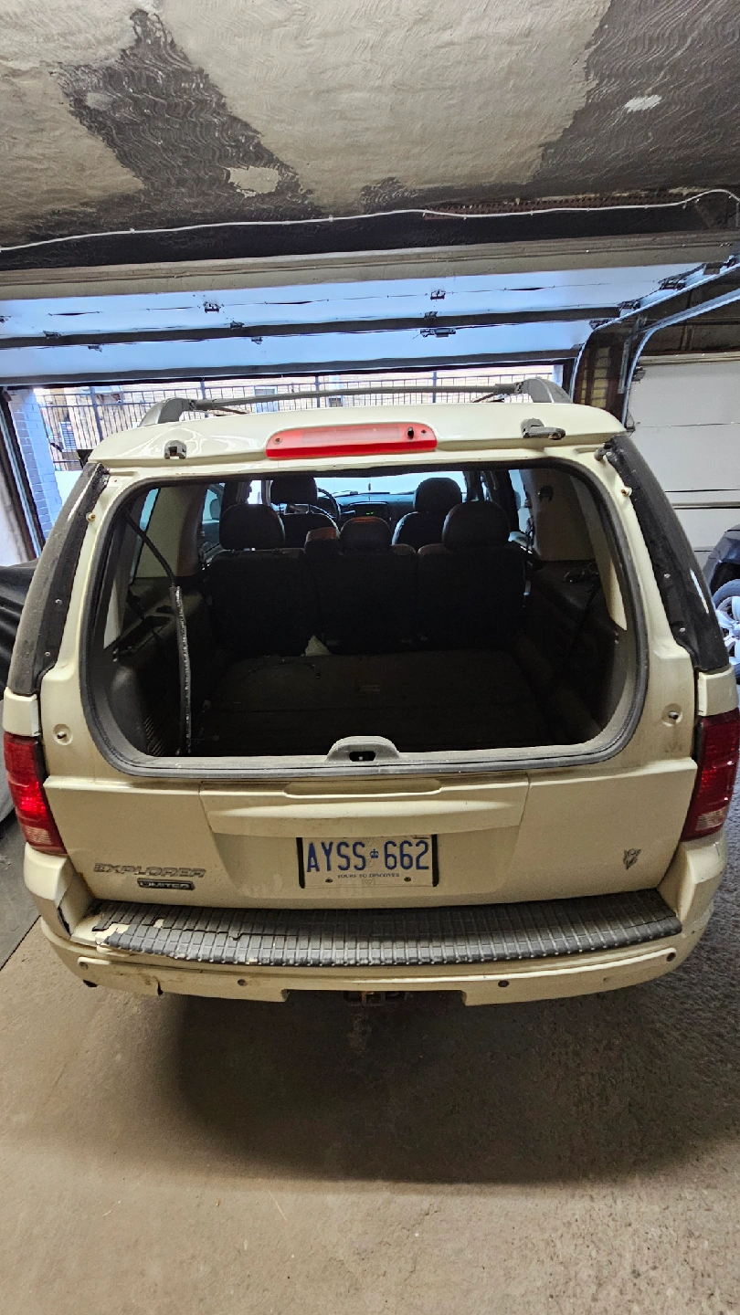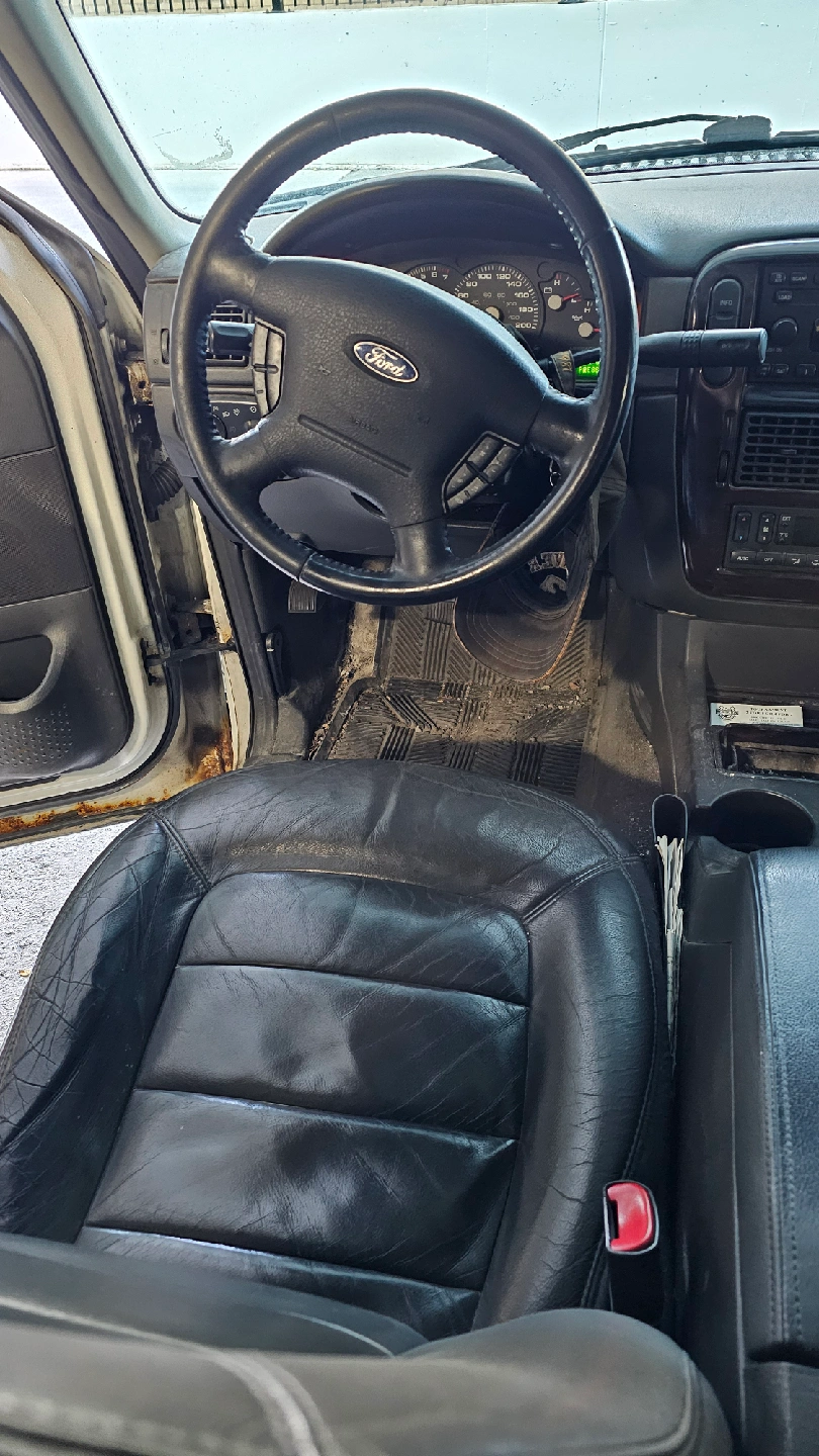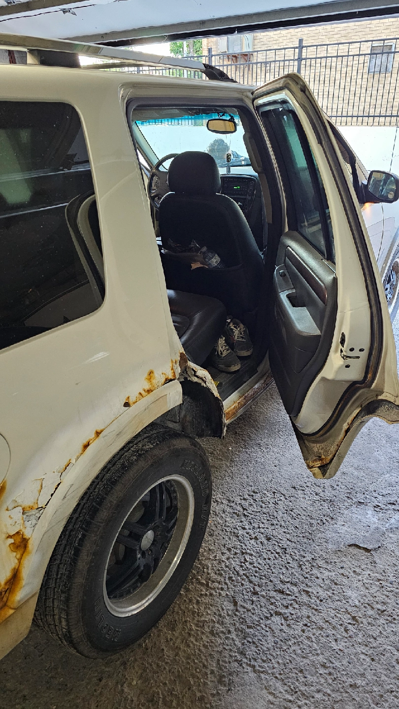 Selling a white 2004 Ford Explorer Limited Edition 4x4. 4.6L V8 engine still runs strong and smooth after 400k Still very drivable and will get you where you need no problem. 17" IKON black/chrome rims Newer all season tires - Neolin Neoland H/T (245 65 R17) used only 1 season Brakes are in great shape Roof racks Front passenger door latch broken so has been sealed shut with tape Heavy rust around both rear wheel wells and other areas Key is stuck in ignition so have to use the keypad for locking/unlocking Rear hatch window is blown out and would need a replacement As Is - $1200 OBO - tires and rims worth at least $400 If any additional pictures are needed please let me know. Thanks.