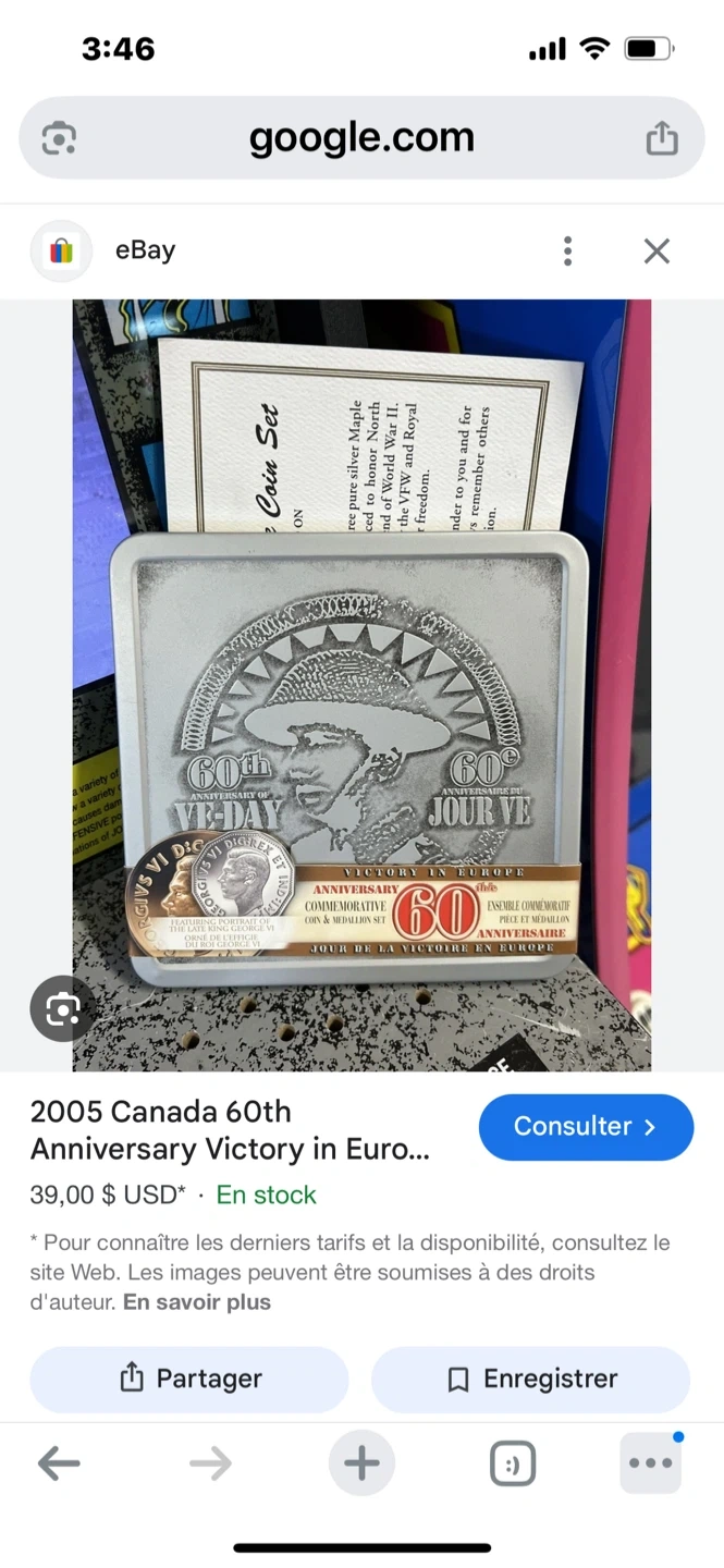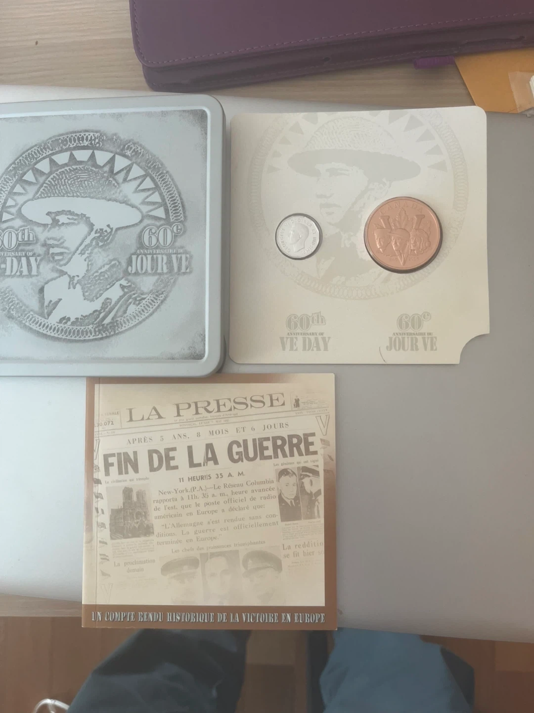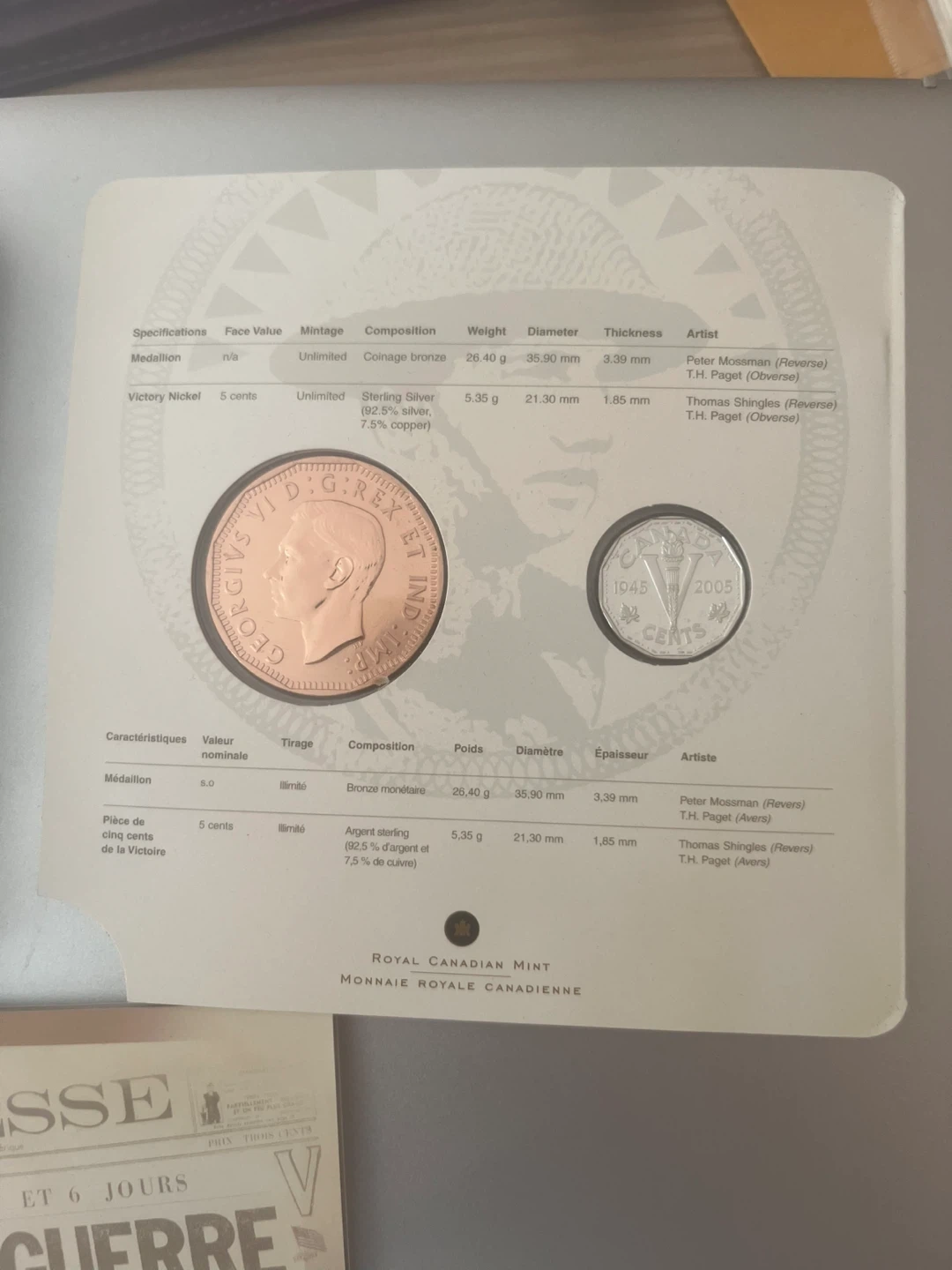Selling a 2005 Canada 60th Anniversary Victory coin set. It commemorates the 60th anniversary of Victory in Europe (VE) Day. The set includes a commemorative coin and a newspaper clipping from La Presse announcing the end of the war. A great piece of Canadian history!