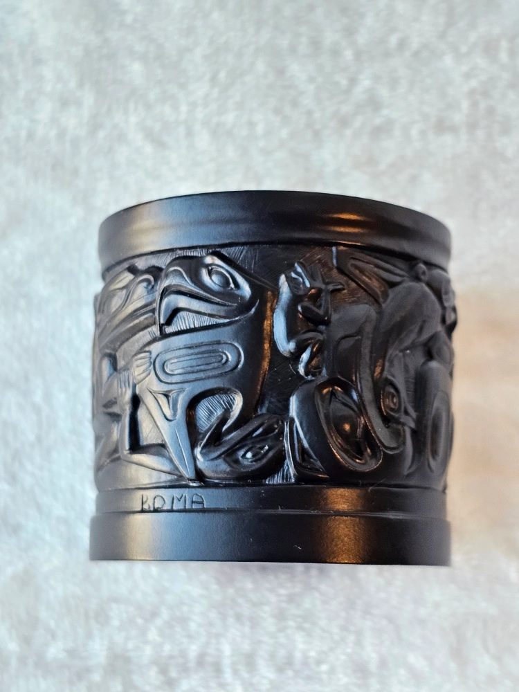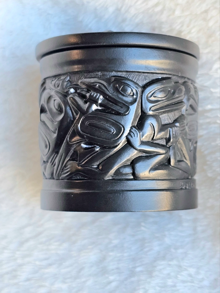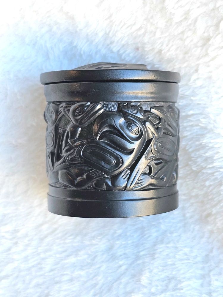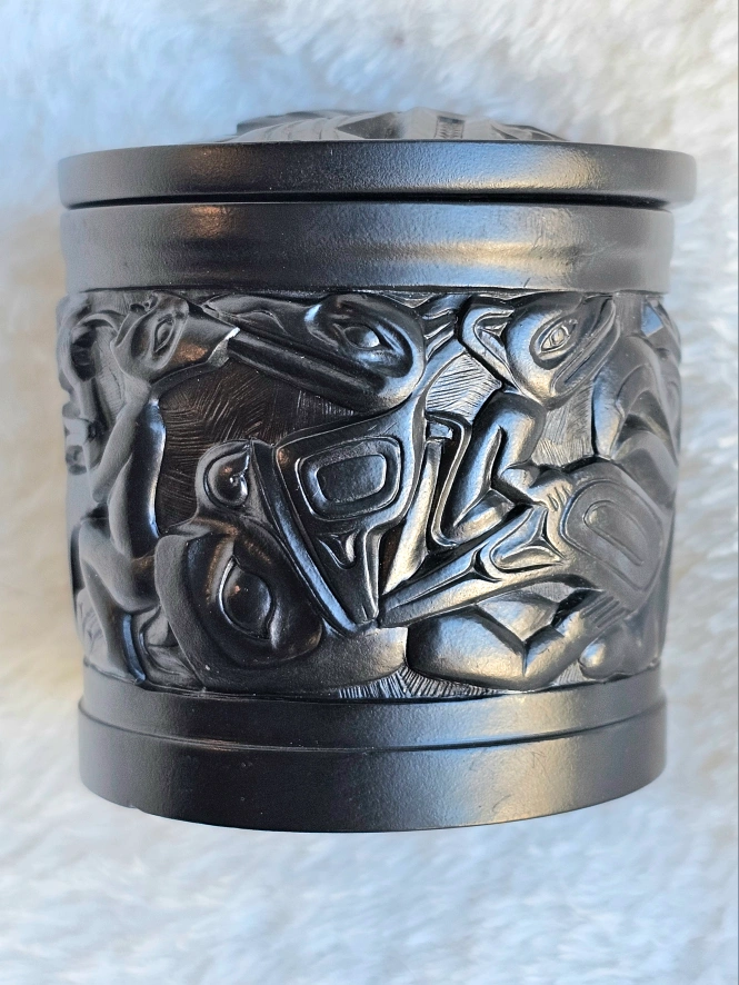 This beautiful jet black vintage 1980 box features an exquisitely detailed Haida carvings.