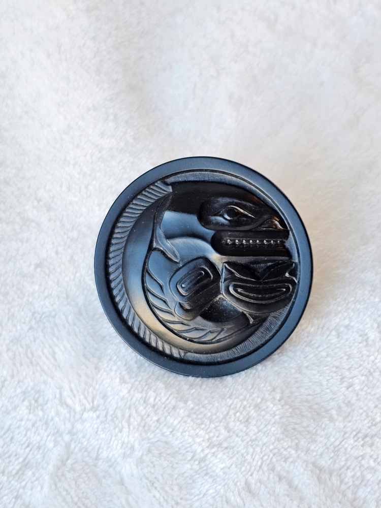 For many, Haida Art plays an important role in the development of the Pacific Northwest Coast indigenous art style. There is one distinct difference in Haida Art compared to other West Coast native art cultures, the black slate material called argillite. Argillite is a dense, black, carbonaceous shale known as kwawhlahl in the Haida language. It is found exclusively at Slatechuck Creek (Tllgaduu randlaay) on Graham Island, the largest and most northerly island in the Haida Gwaii archipelago (formerly known as the Queen Charlotte Islands). Haida artists have been carving argillite for generations. In 1941 the Haida received exclusive rights to the Slatechuck quarry. Anyone who wishes to visit must first obtain permission from the Haida Skidegate Band Council. For those who wish to know more about this unique sculptural tradition, Carol Sheehan's book 'Breathing Stone' is an excellent resource on contemporary Haida argillite carving and art.