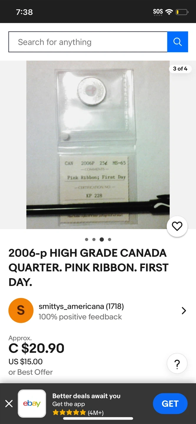 Selling a 2006-P high-grade Canada quarter featuring the Pink Ribbon design! It's a great piece for any collector!