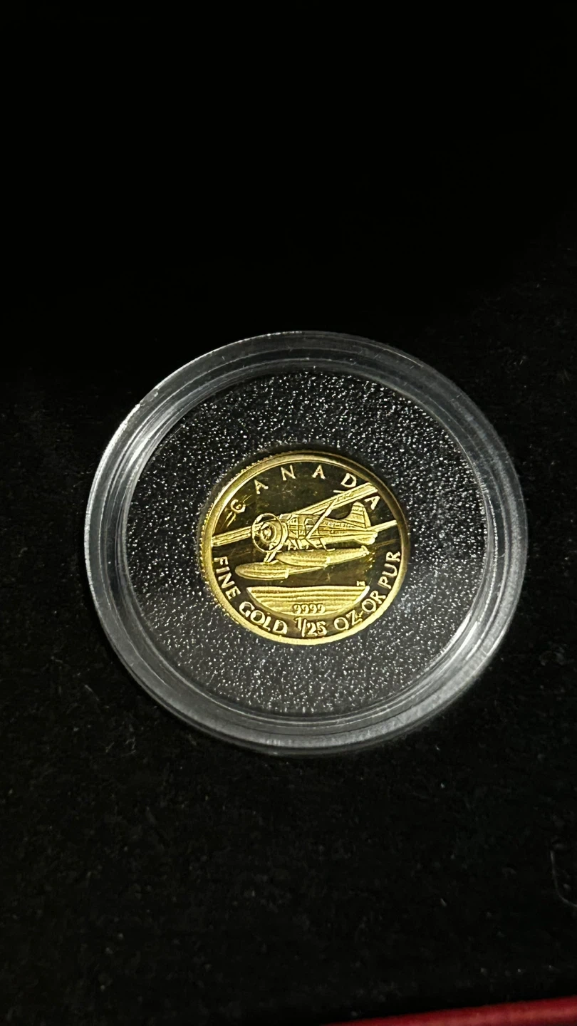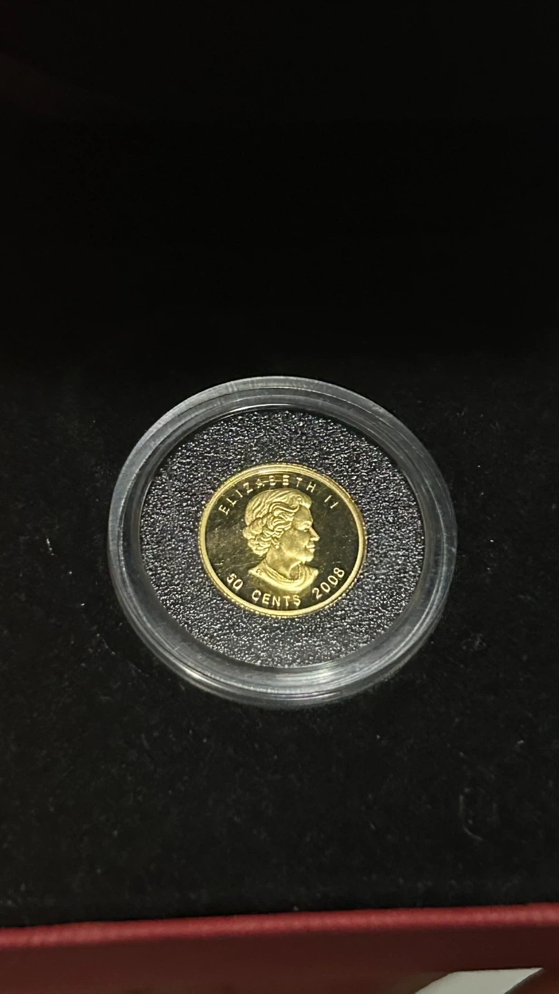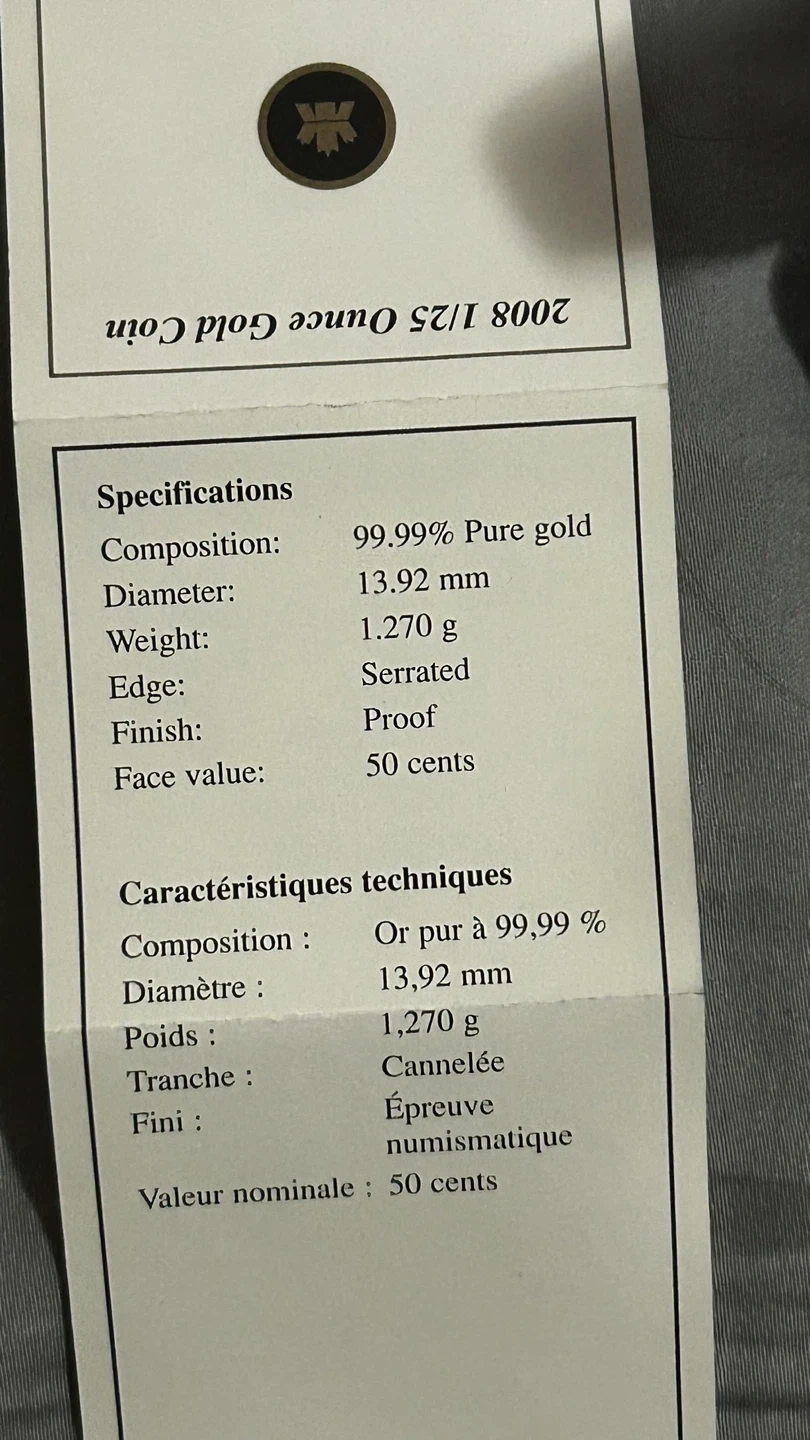 84Selling a Royal Canadian Mint 2008 1/25 ounce gold coin. It's 99.99% pure gold with a diameter of 13.92 mm and weighs 1.270 g. It Comes with the original box!