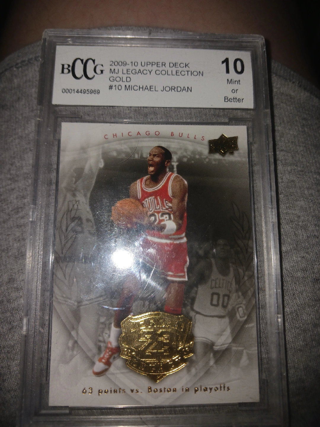 Selling a 2009-10 Upper Deck MJ Legacy Collection Gold #10 Michael Jordan card. It's graded BCCG 10, indicating mint or better condition. A great addition for any Chicago Bulls or Michael Jordan fan!