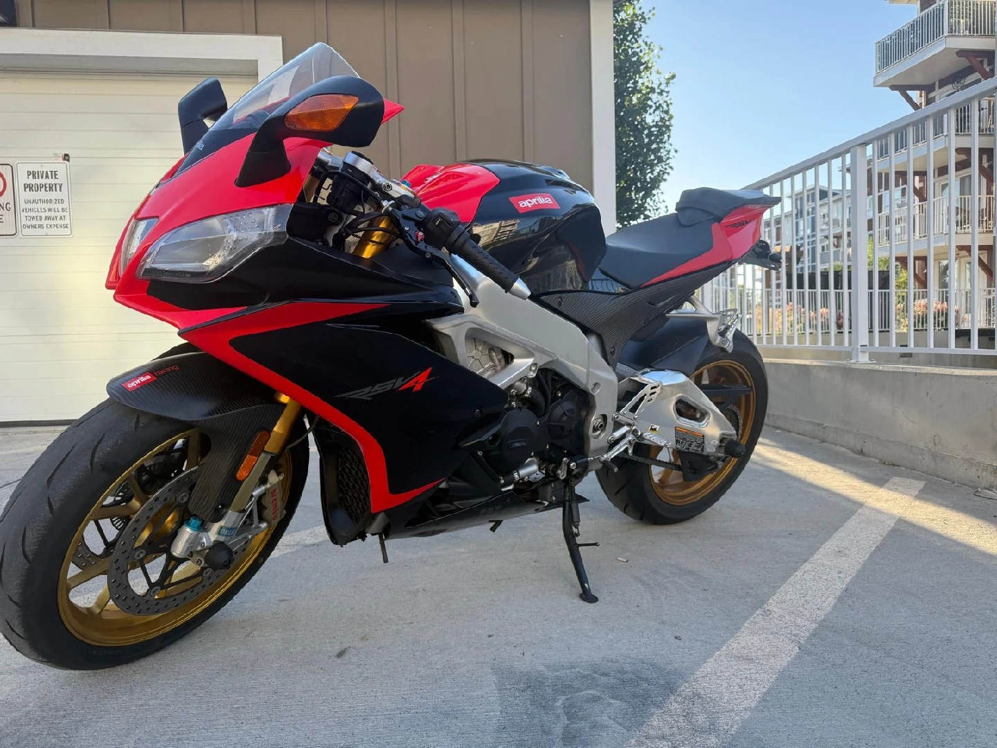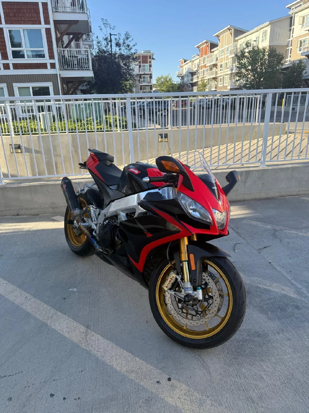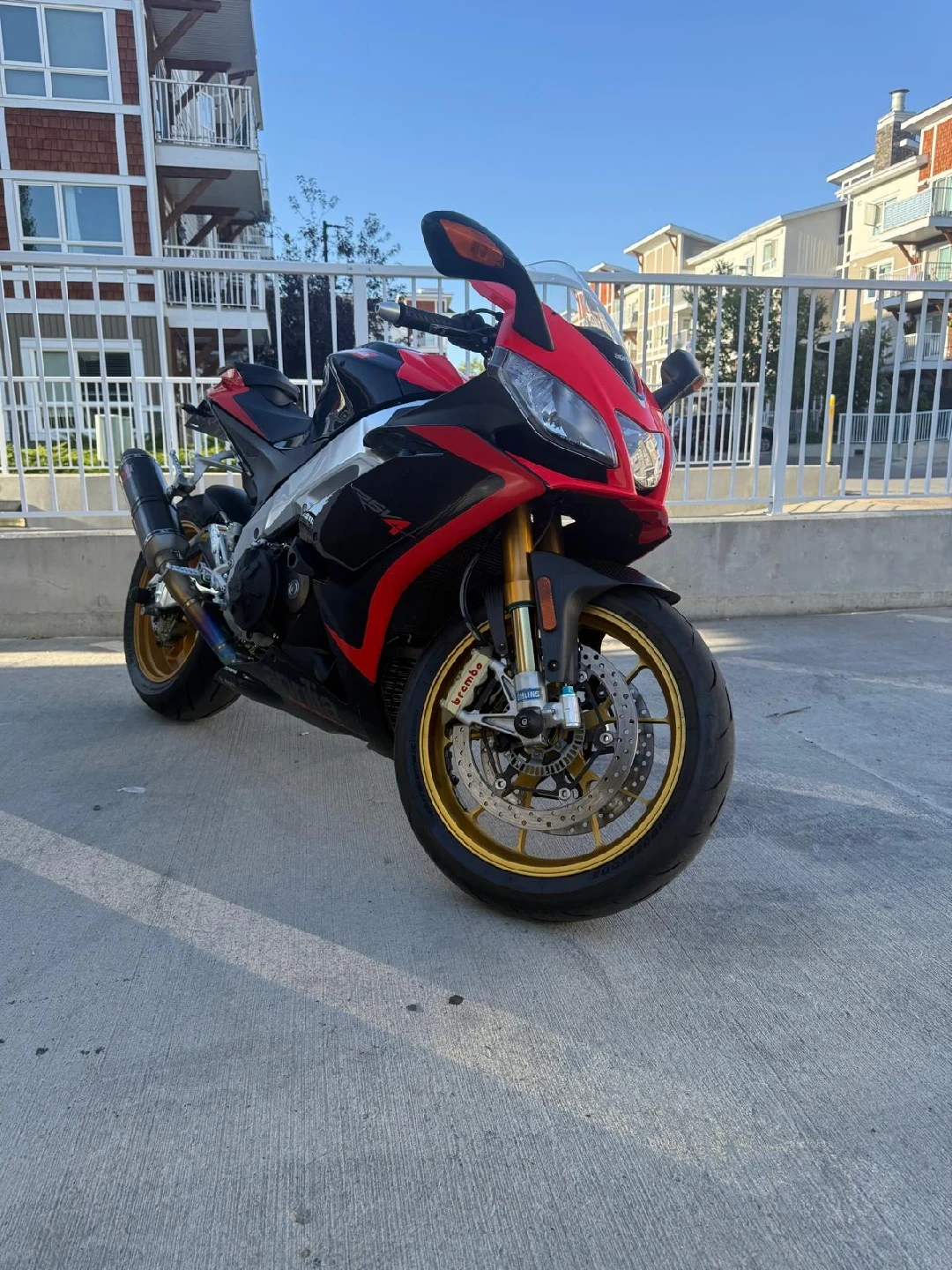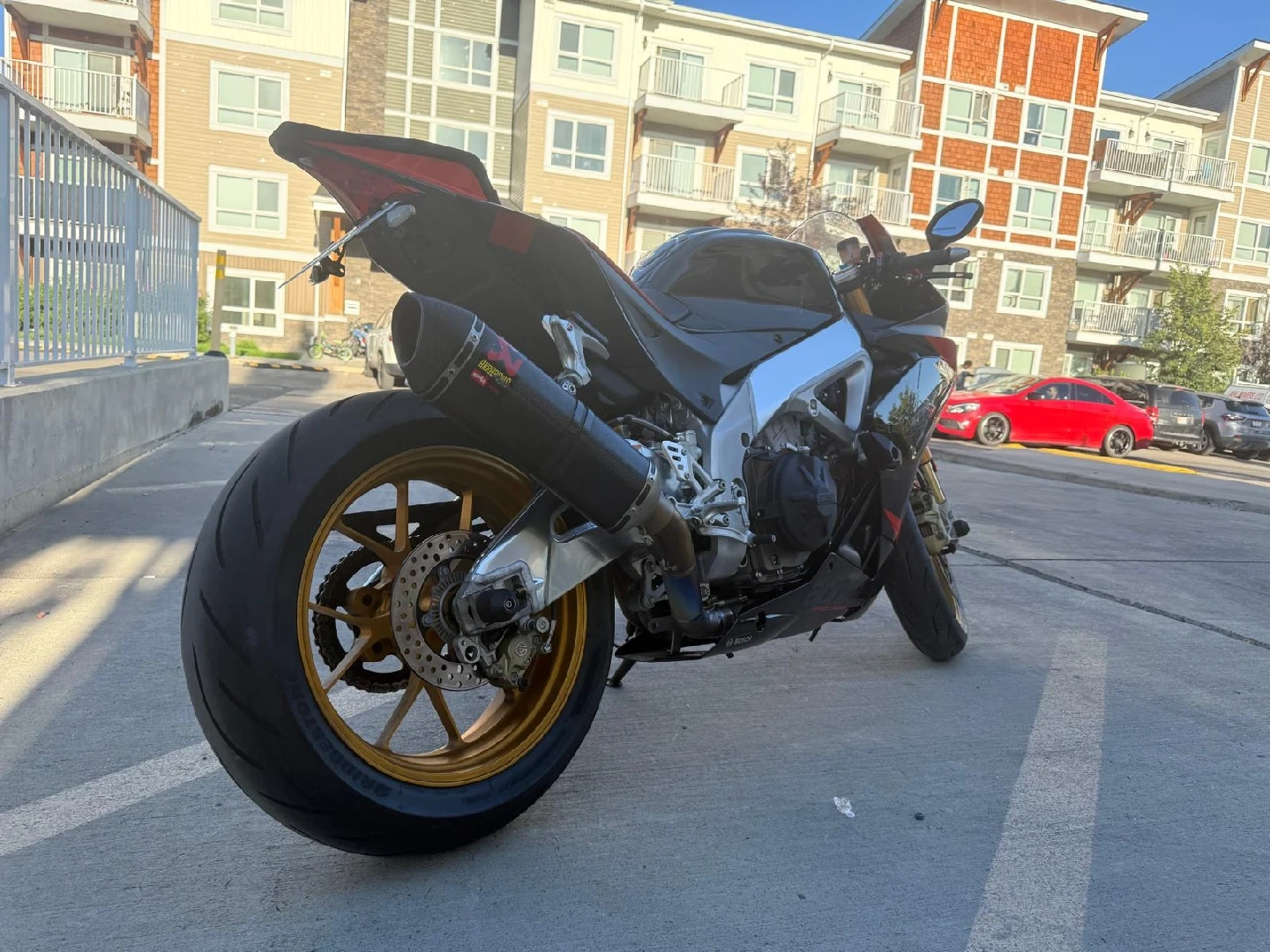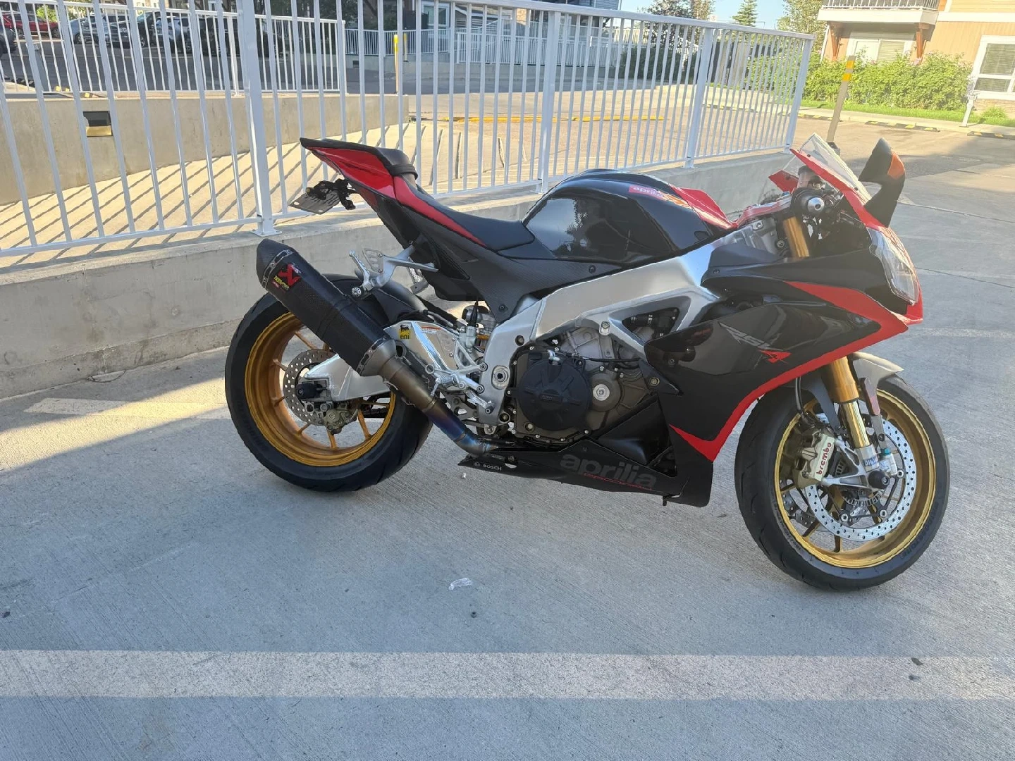 10Selling an Aprilia RSV4 motorcycle. It has a black and red colour scheme with gold wheels. The exhaust is Akrapovic. well maintained