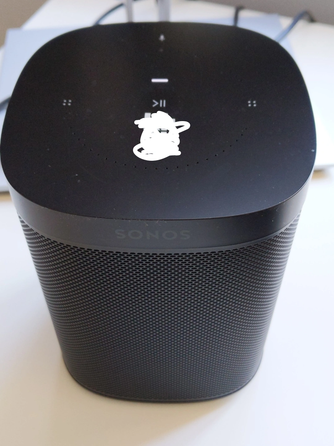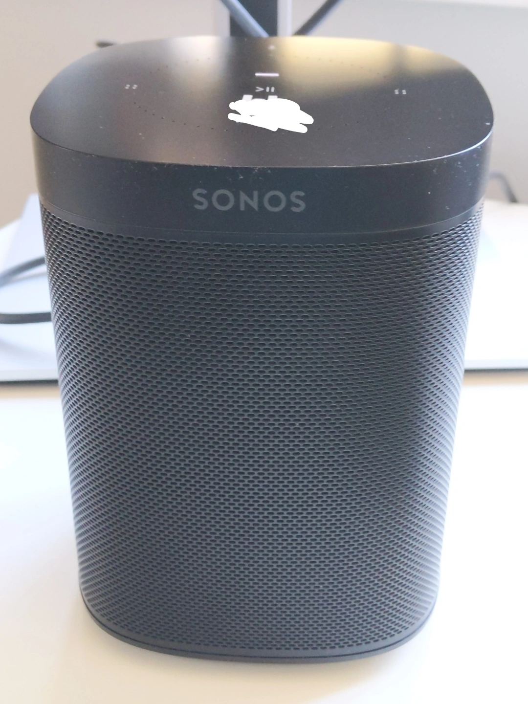 Selling a Sonos One (Gen 2) speaker in a "Like new" condition. Works without any issues. No scratches. Purchased in 2022 for 200$ through an employer program. Employer name has been redacted in the picture but will be present on the speaker.
