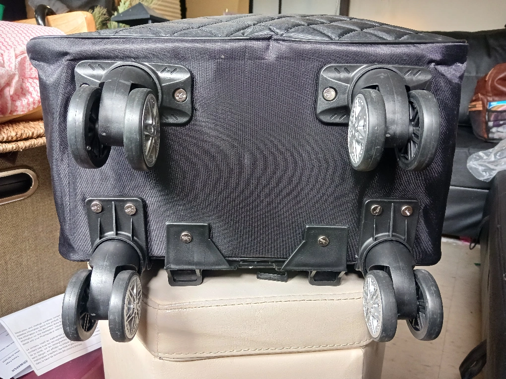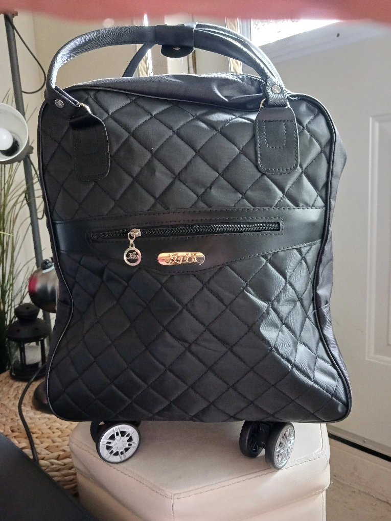 Quilted luxury look. Faux leather, retractable handle. 365° spinner wheel. Multiple compartments. Get it before I gift it😄