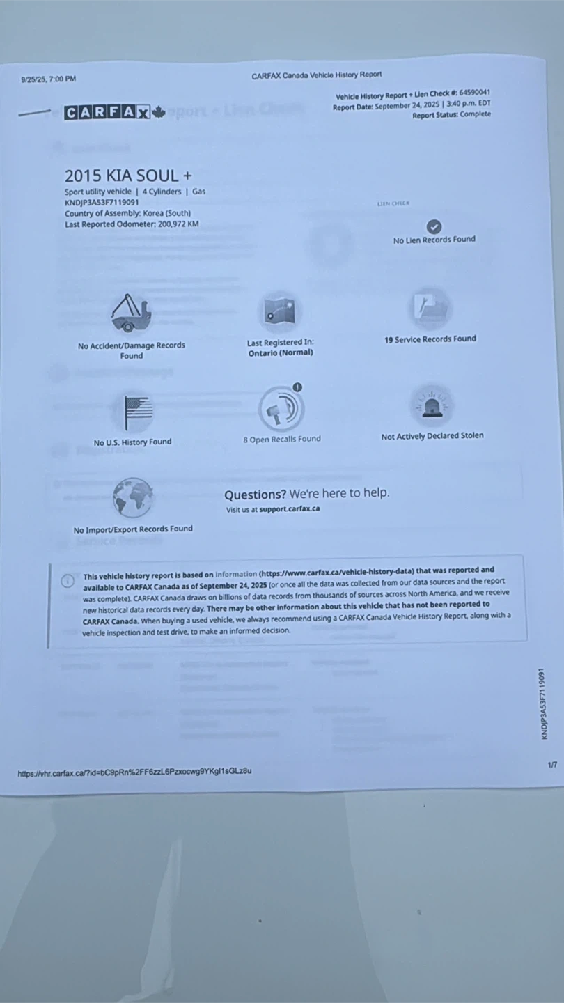 65Check out all photos before inquiries π πKia Soul for Sale β Mileage: 212,650 km β Accident-Free β 19 Service Records Available β 2 Owners β Heated Seats β Alloy Rims β Keyless Entry β Car fax available π Runs and drives well β reliable car for daily use. π§ For safety, it may need brakes. π₯ Has one small dent and a little rust spot on the trunk, but overall in good condition. Priced to sell β message me for more details or to schedule a viewing!