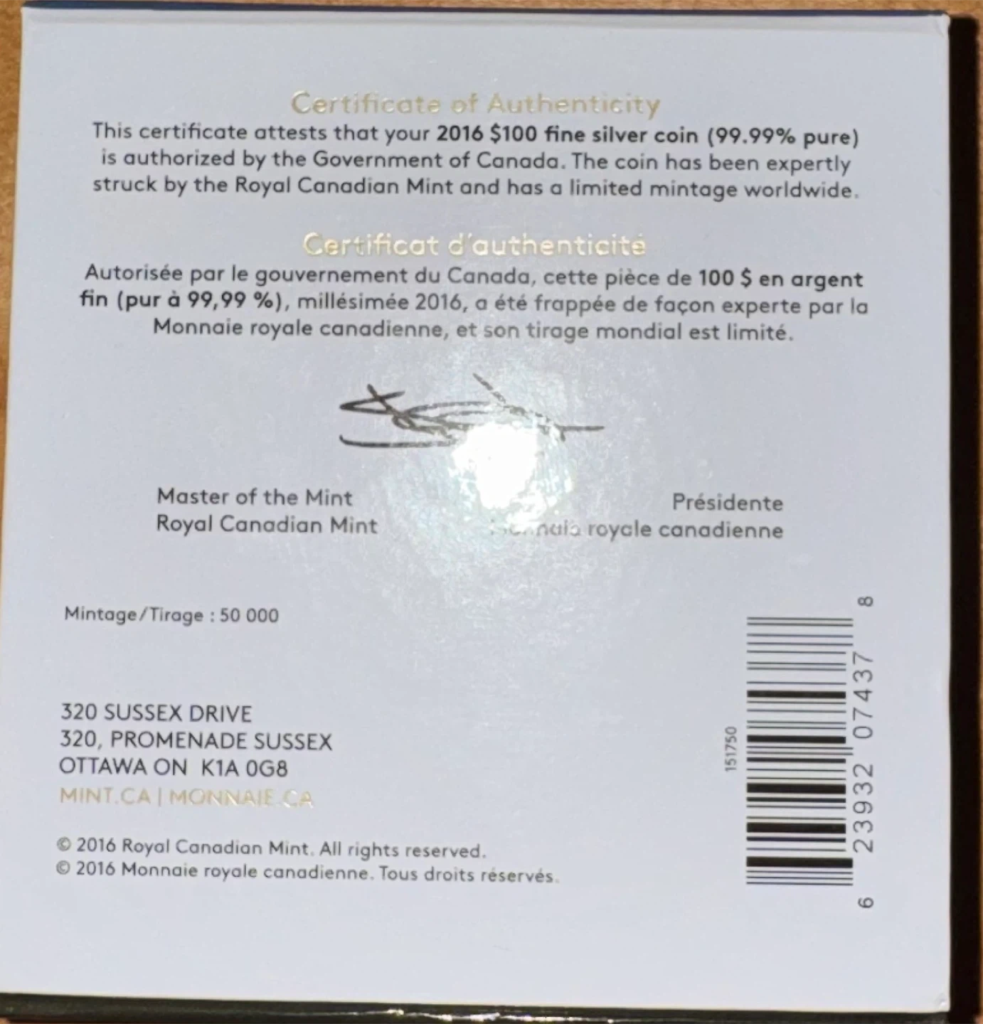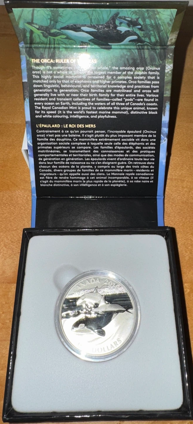 20Selling a beautiful 2016 $100 fine silver coin from the Royal Canadian Mint. The coin features an orca design and comes with a certificate of authenticity. The coin is 99.99% pure silver.