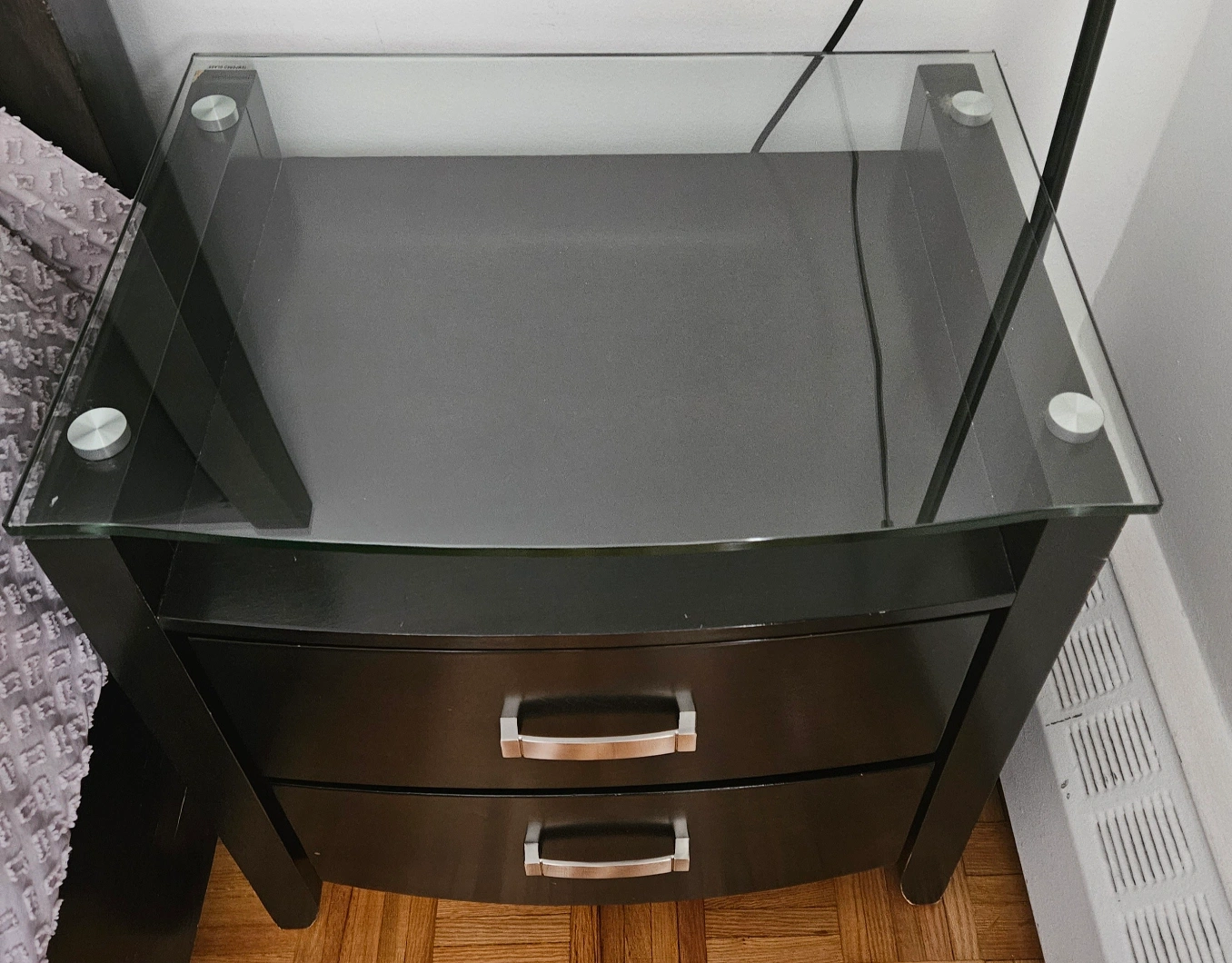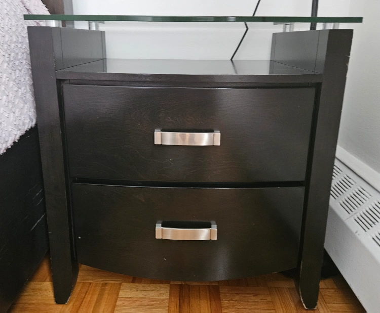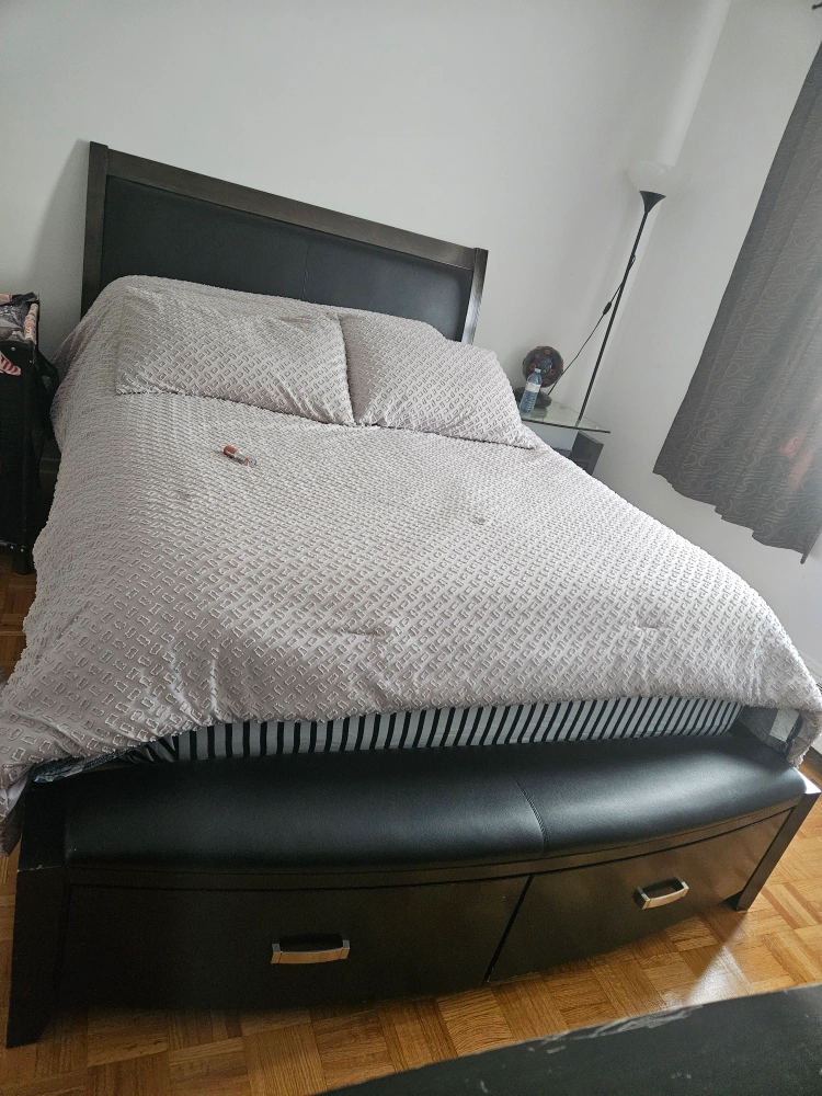Queen bed frame with a night table a side is the bed frame is leder very good condition is very nice and clean the bed has also two drawers luge to put stuff there + the storage under the bed has space to put stuff under the bed as well it comes with out mattres
