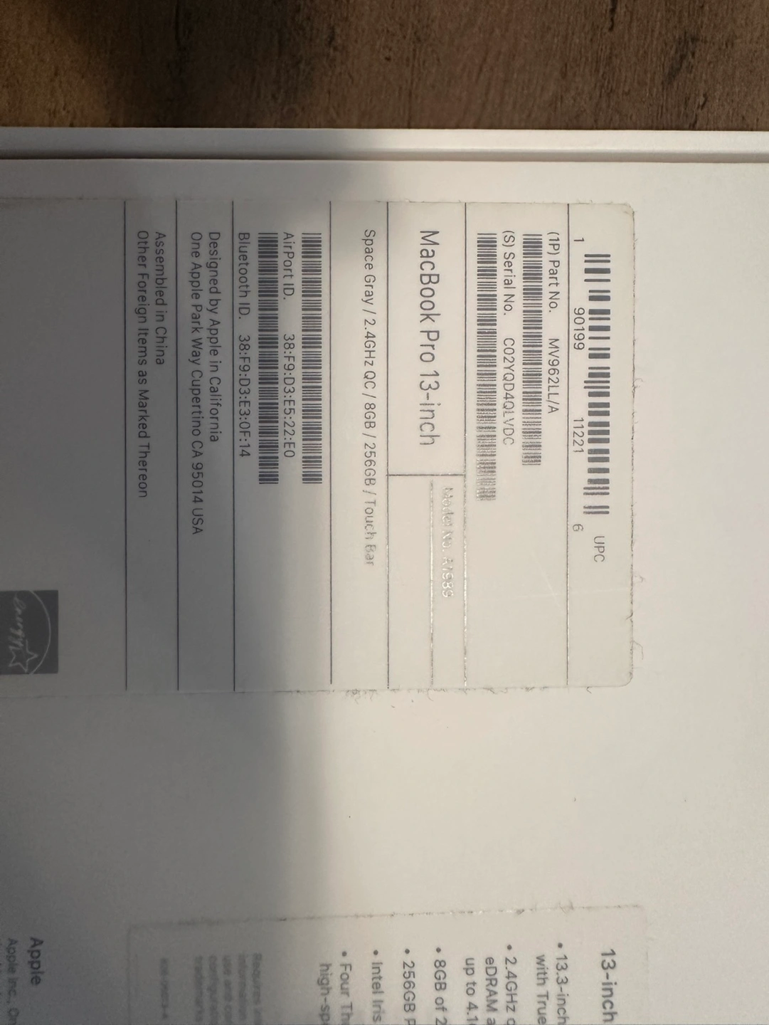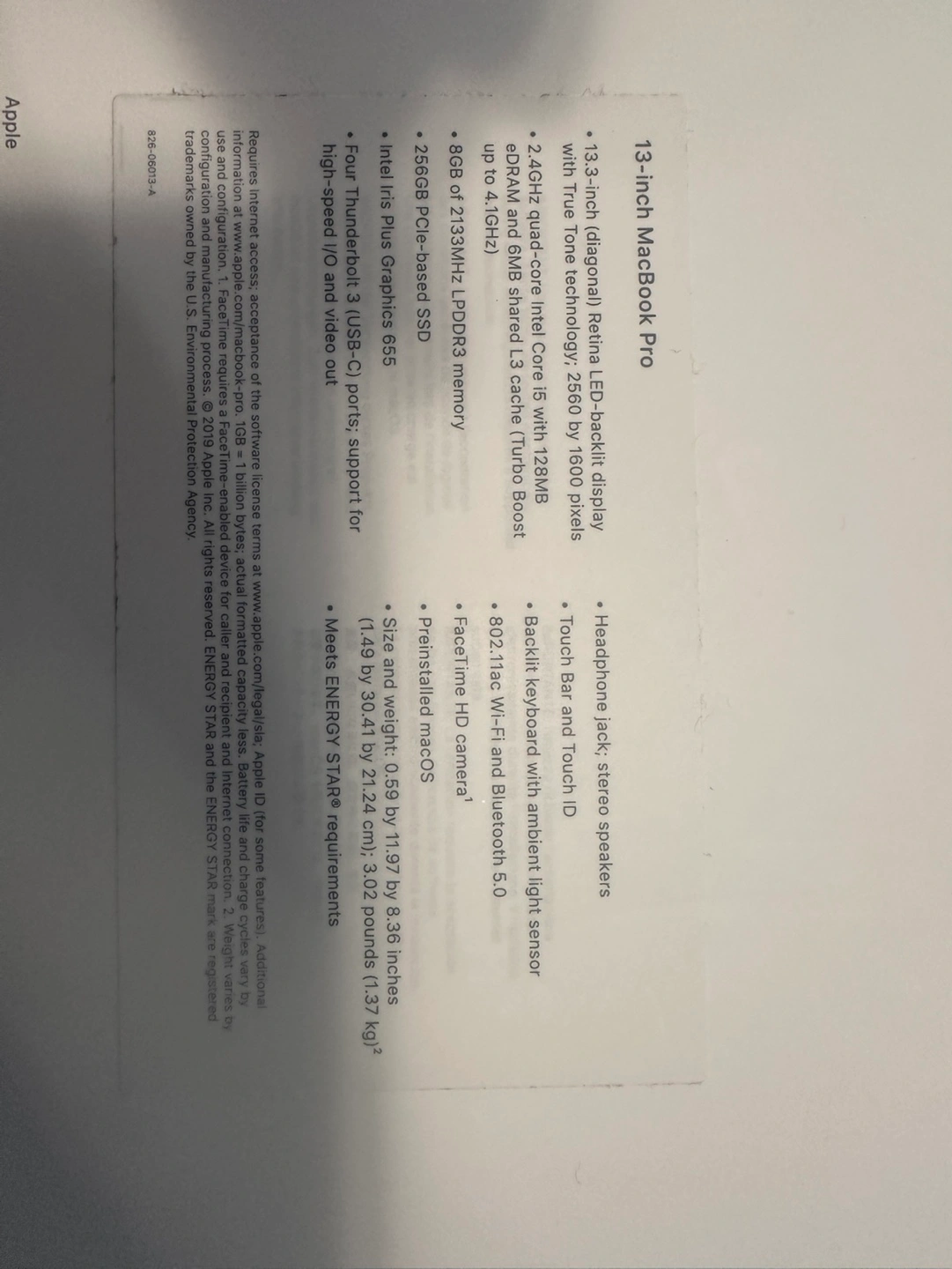 5Late 2019 MacBook Pro 13 i5 8gb 256gb Dropped once so has scuff on the edge - see photos Other than cosmetics issue, it works as fine Box, charger, original receipt of purchase from Best Buy included