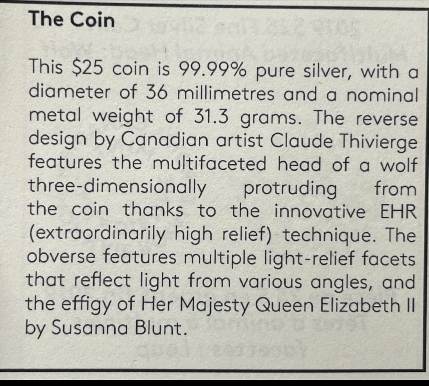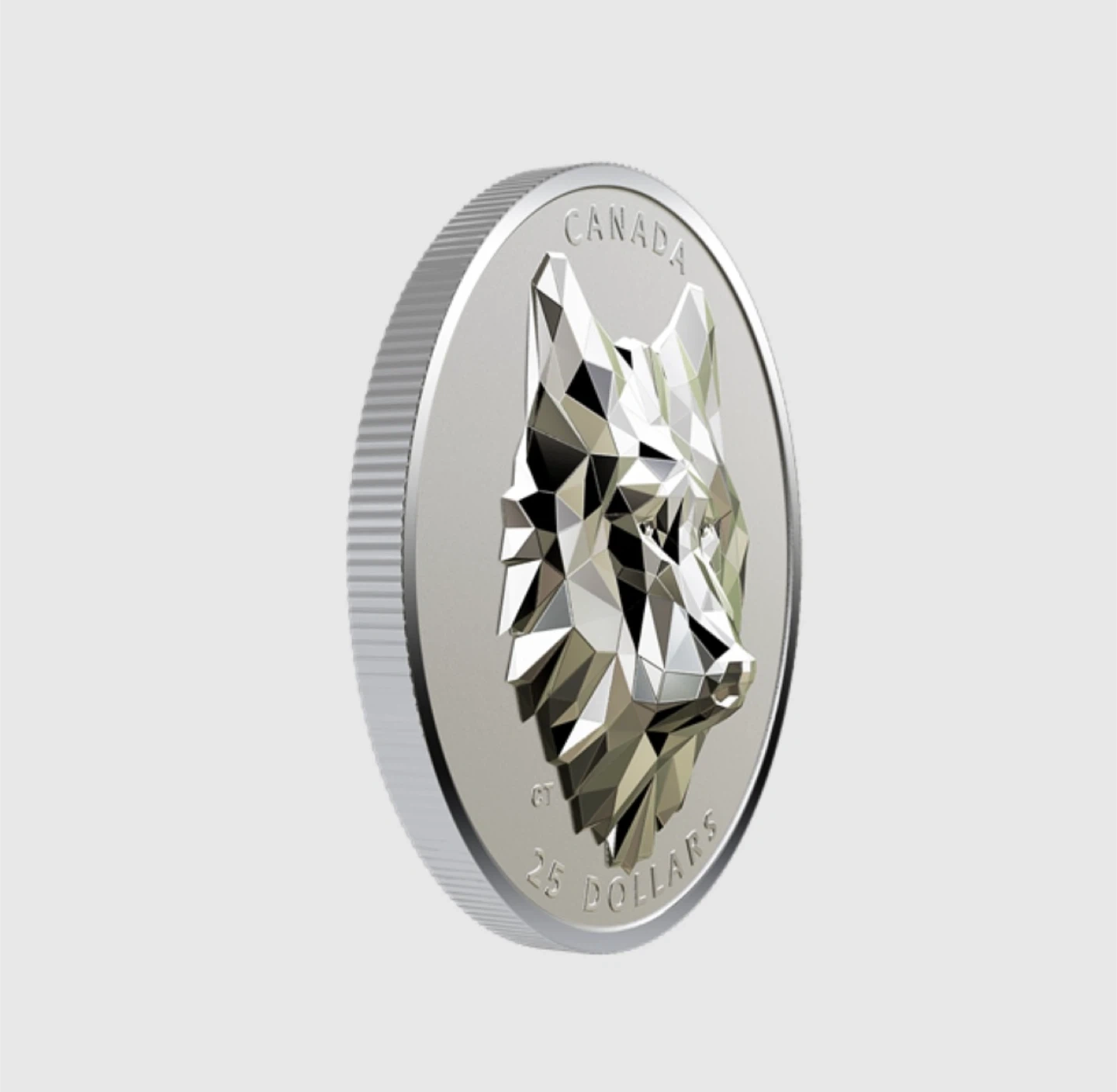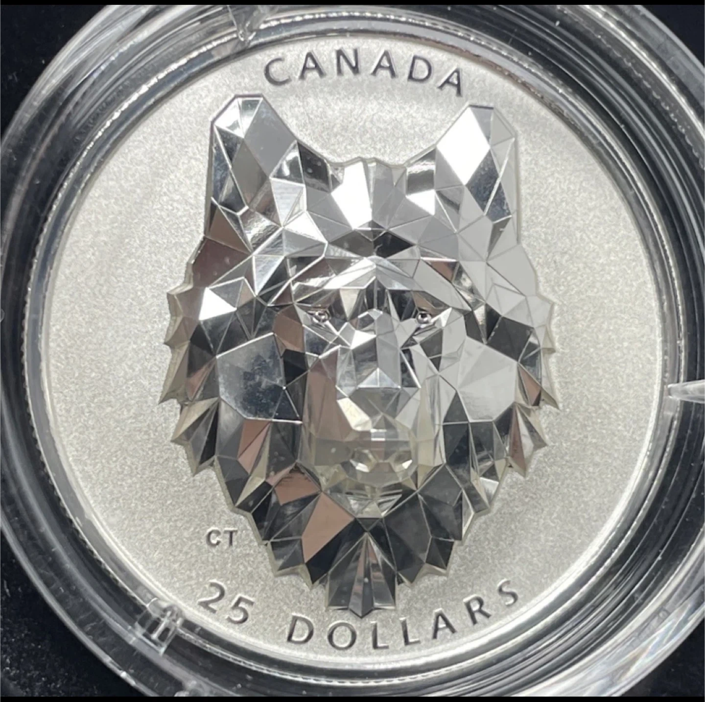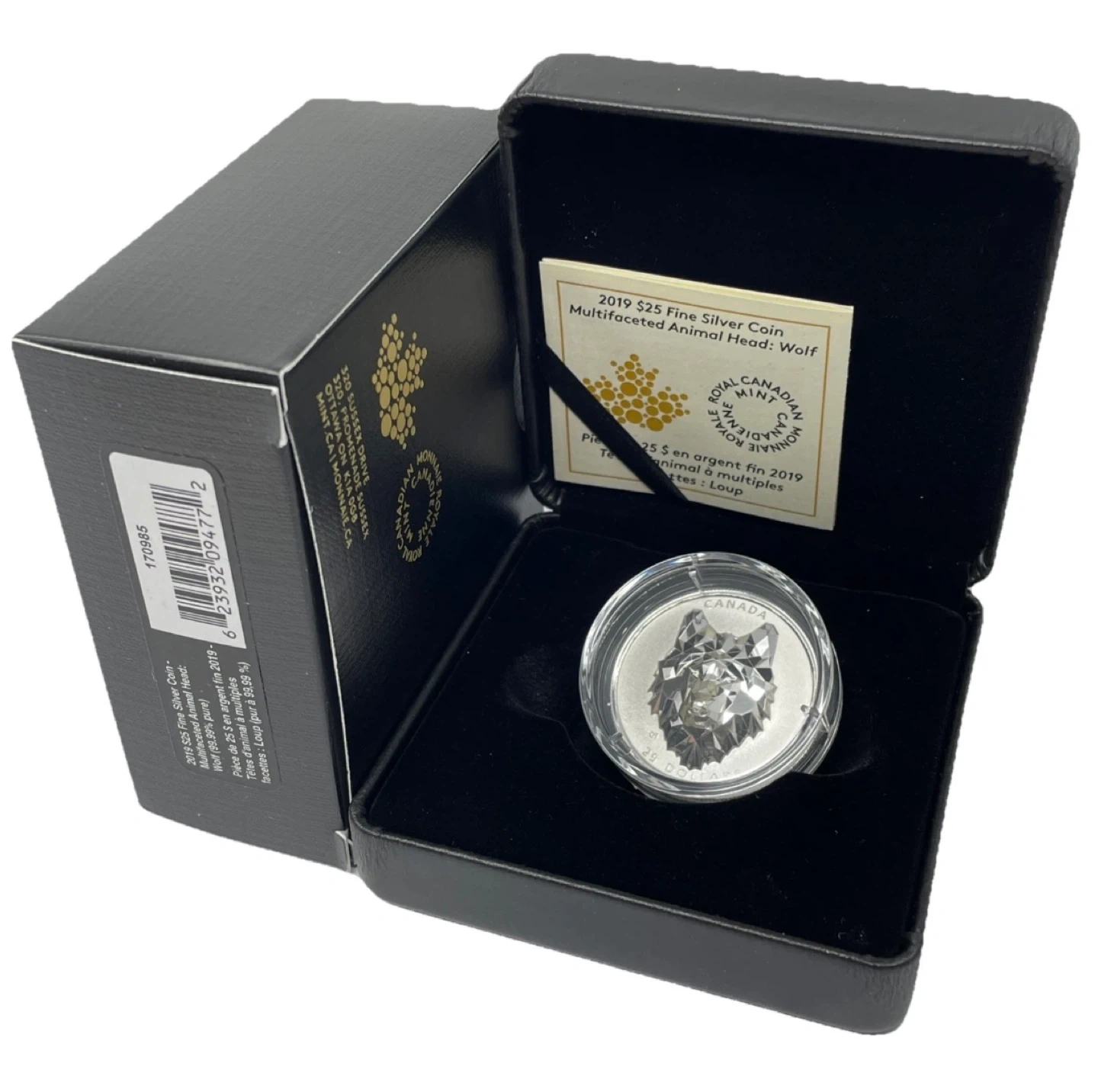 Selling a 2019 $25 Fine Silver Coin from the Royal Canadian Mint. This coin features a multifaceted animal head: Wolf. It is 99.99% pure silver with a diameter of 36 millimetres and a nominal metal weight of 31.3 grams. The reverse design is by Canadian artist Claude Thivierge.