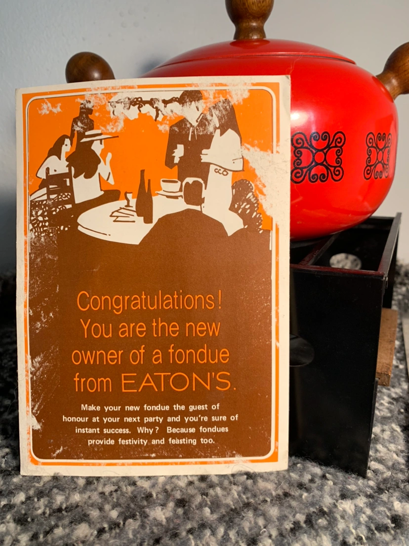 Never used absolutely perfect vintage fondu pot from Eatons Department Store, comes with booklet and 4 skewers. Enameled aluminum.