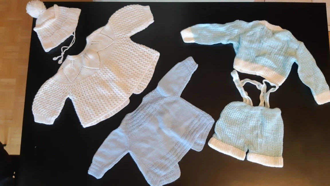 Hand knit one of a kind pieces; 3 sweater cardigans, one overall(knit), hat and booties.