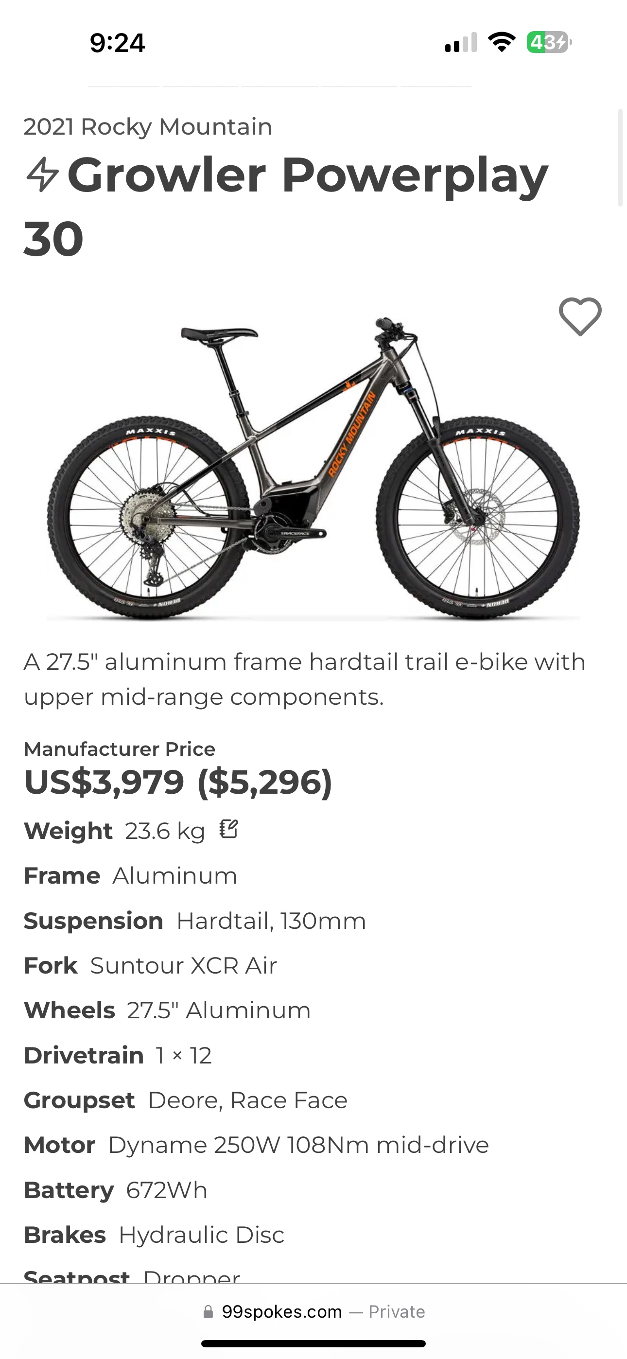 182021 Electric mountain bike. Rocky Mountain Powerplay 30 HardTail Size Medium 27.5 specifications: https://99spokes.com/en-CA/bikes/rockymountain/2021/growler-powerplay-30